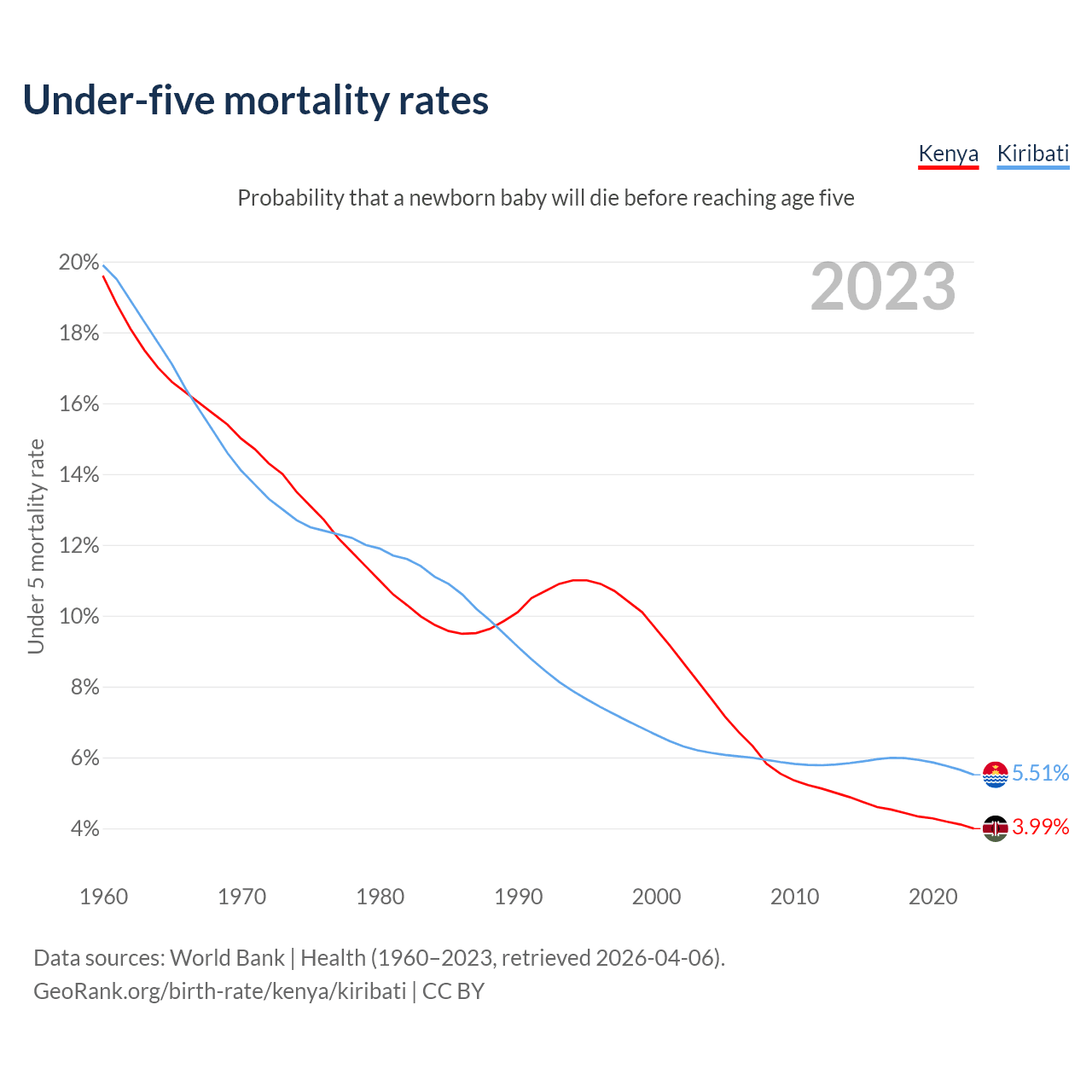 The chance that a newborn baby will die before reaching age five is 3.99% in Kenya and 5.51% in Kiribati. Above is a chart with historical data on under-five mortality rates.