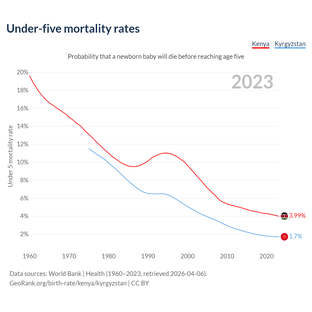 The chance that a newborn baby will die before reaching age five is 3.99% in Kenya and 1.7% in Kyrgyzstan. Above is a chart with historical data on under-five mortality rates.