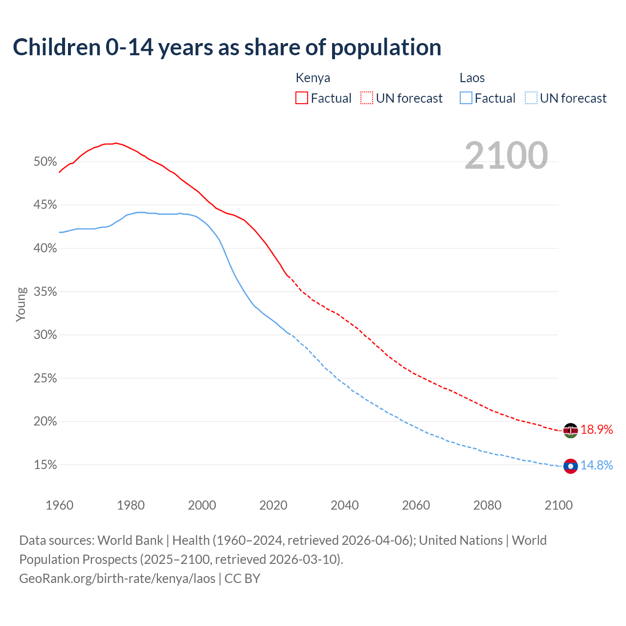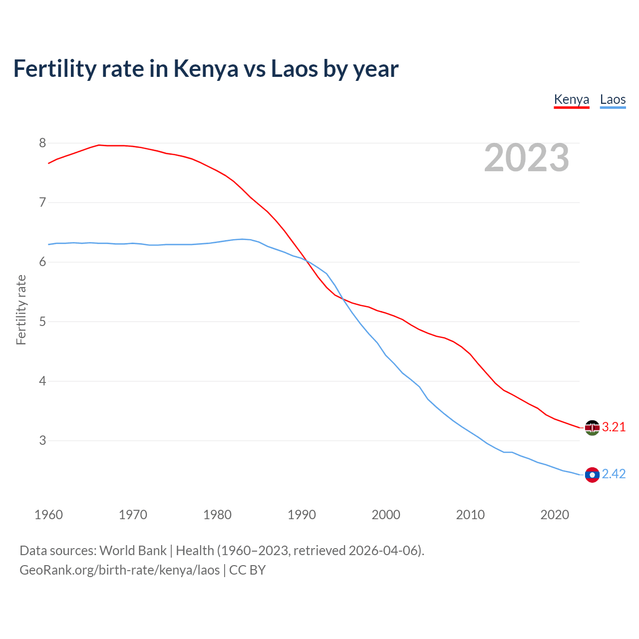 According to the latest available data on birth rates, the fertility rate in Kenya was 3.21 children per woman in 2023, compared to 2.42 in Laos in 2023. The replacement level is considered to be 2.1 children per woman.