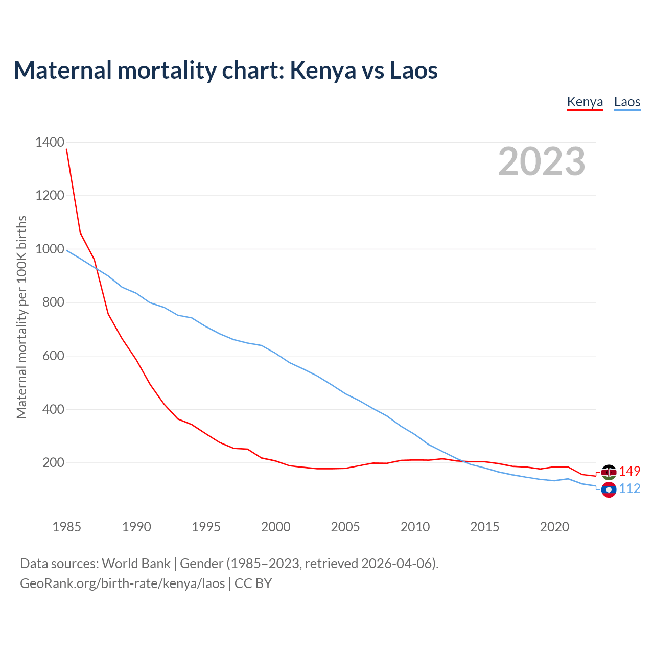 The maternal mortality rate, which is the probability of dying during childbirth or within 42 days of pregnancy termination, is 149 deaths per 100,000 live births in Kenya, compared to 112 deaths in Laos.