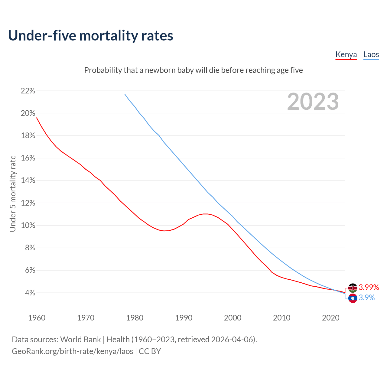 The chance that a newborn baby will die before reaching age five is 3.99% in Kenya and 3.9% in Laos. Above is a chart with historical data on under-five mortality rates.