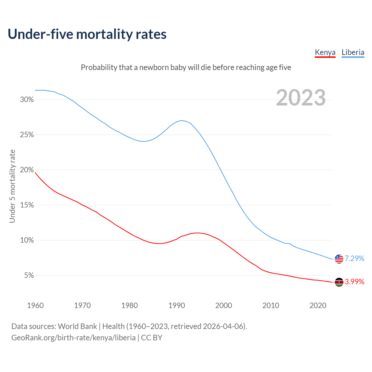 The chance that a newborn baby will die before reaching age five is 3.99% in Kenya and 7.29% in Liberia. Above is a chart with historical data on under-five mortality rates.