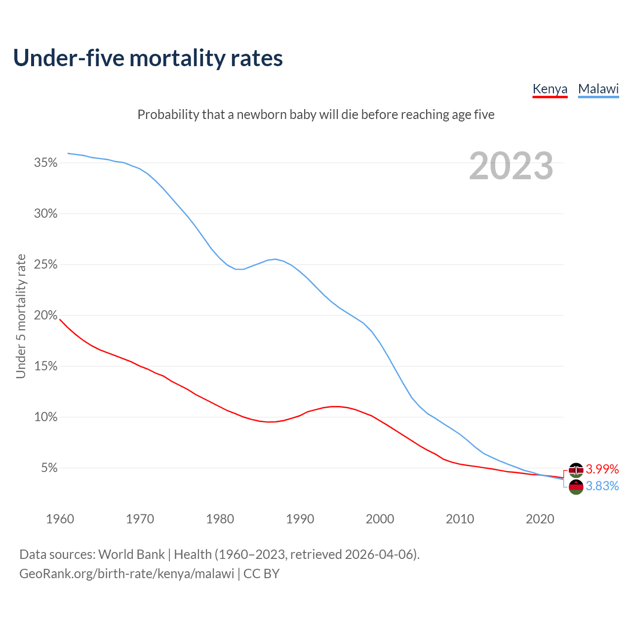 The chance that a newborn baby will die before reaching age five is 3.99% in Kenya and 3.83% in Malawi. Above is a chart with historical data on under-five mortality rates.