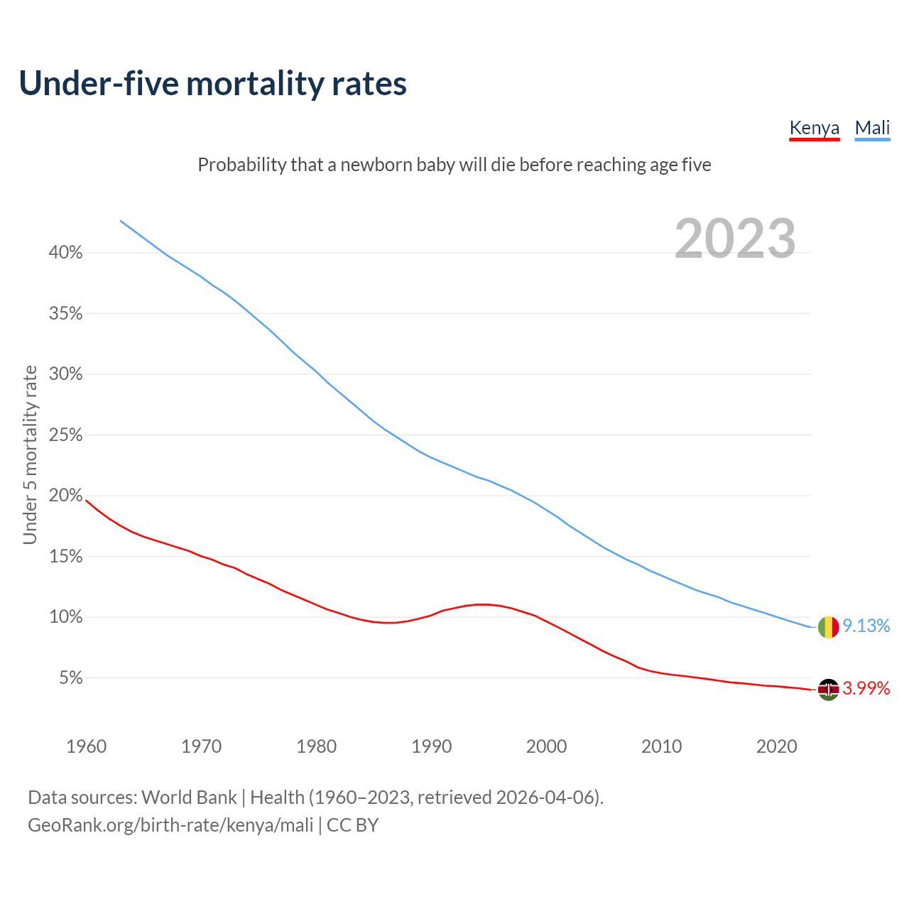 The chance that a newborn baby will die before reaching age five is 3.99% in Kenya and 9.13% in Mali. Above is a chart with historical data on under-five mortality rates.