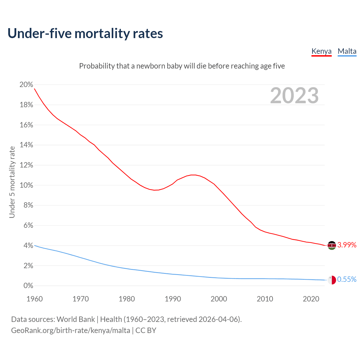 The chance that a newborn baby will die before reaching age five is 3.99% in Kenya and 0.55% in Malta. Above is a chart with historical data on under-five mortality rates.