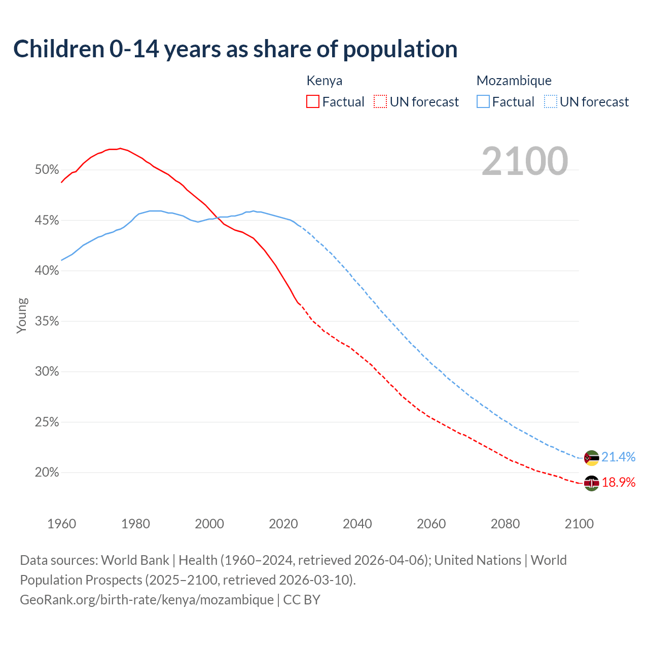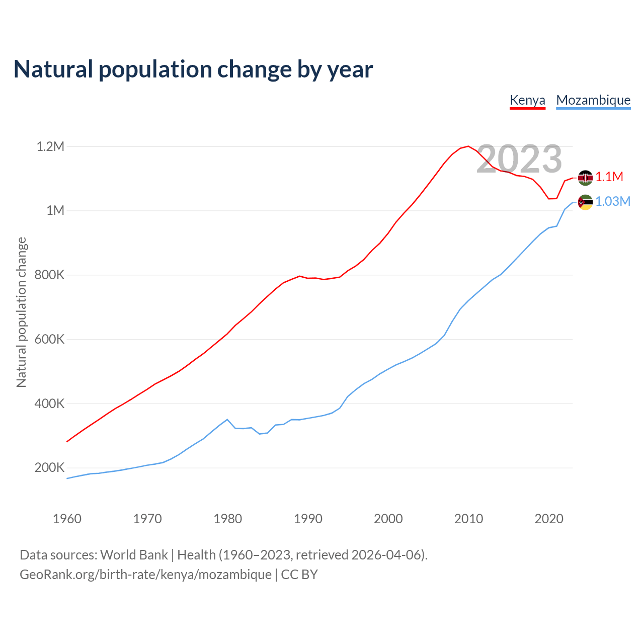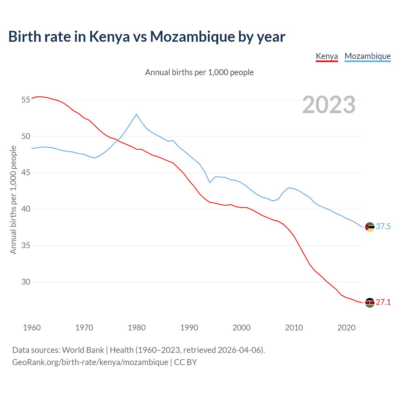 According to the latest available data on birth rates, the fertility rate in Kenya was 3.21 children per woman in 2023, compared to 4.76 in Mozambique in 2023. The replacement level is considered to be 2.1 children per woman.