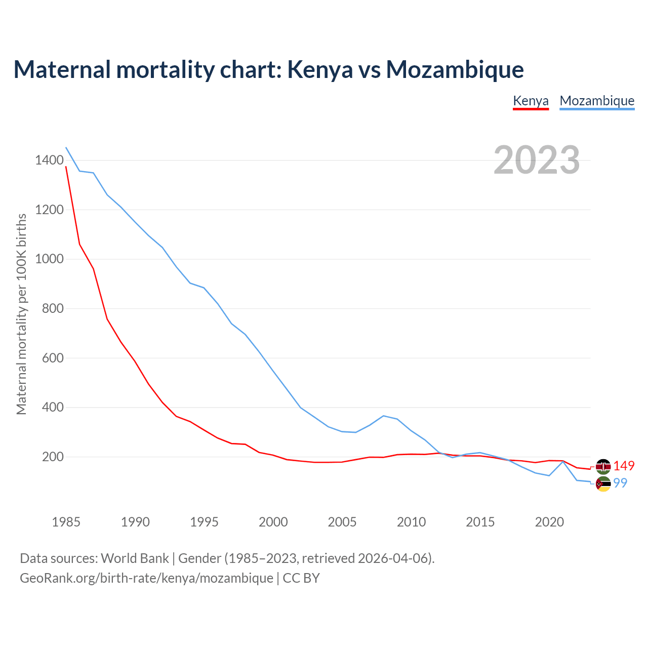 The maternal mortality rate, which is the probability of dying during childbirth or within 42 days of pregnancy termination, is 149 deaths per 100,000 live births in Kenya, compared to 99 deaths in Mozambique.