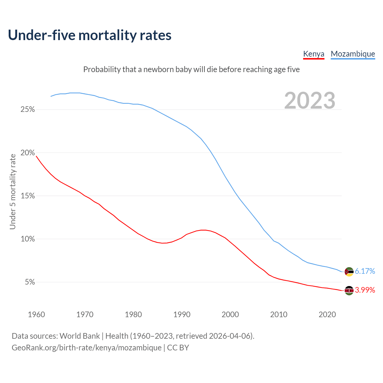 The chance that a newborn baby will die before reaching age five is 3.99% in Kenya and 6.17% in Mozambique. Above is a chart with historical data on under-five mortality rates.