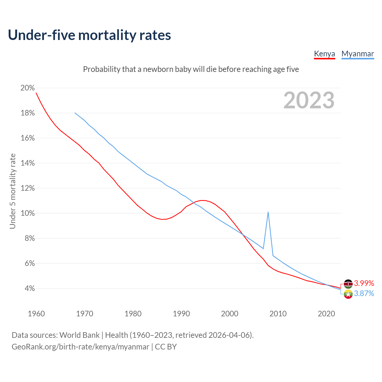 The chance that a newborn baby will die before reaching age five is 3.99% in Kenya and 3.87% in Myanmar. Above is a chart with historical data on under-five mortality rates.