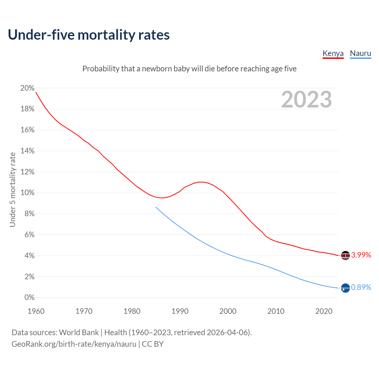 The chance that a newborn baby will die before reaching age five is 3.99% in Kenya and 0.89% in Nauru. Above is a chart with historical data on under-five mortality rates.