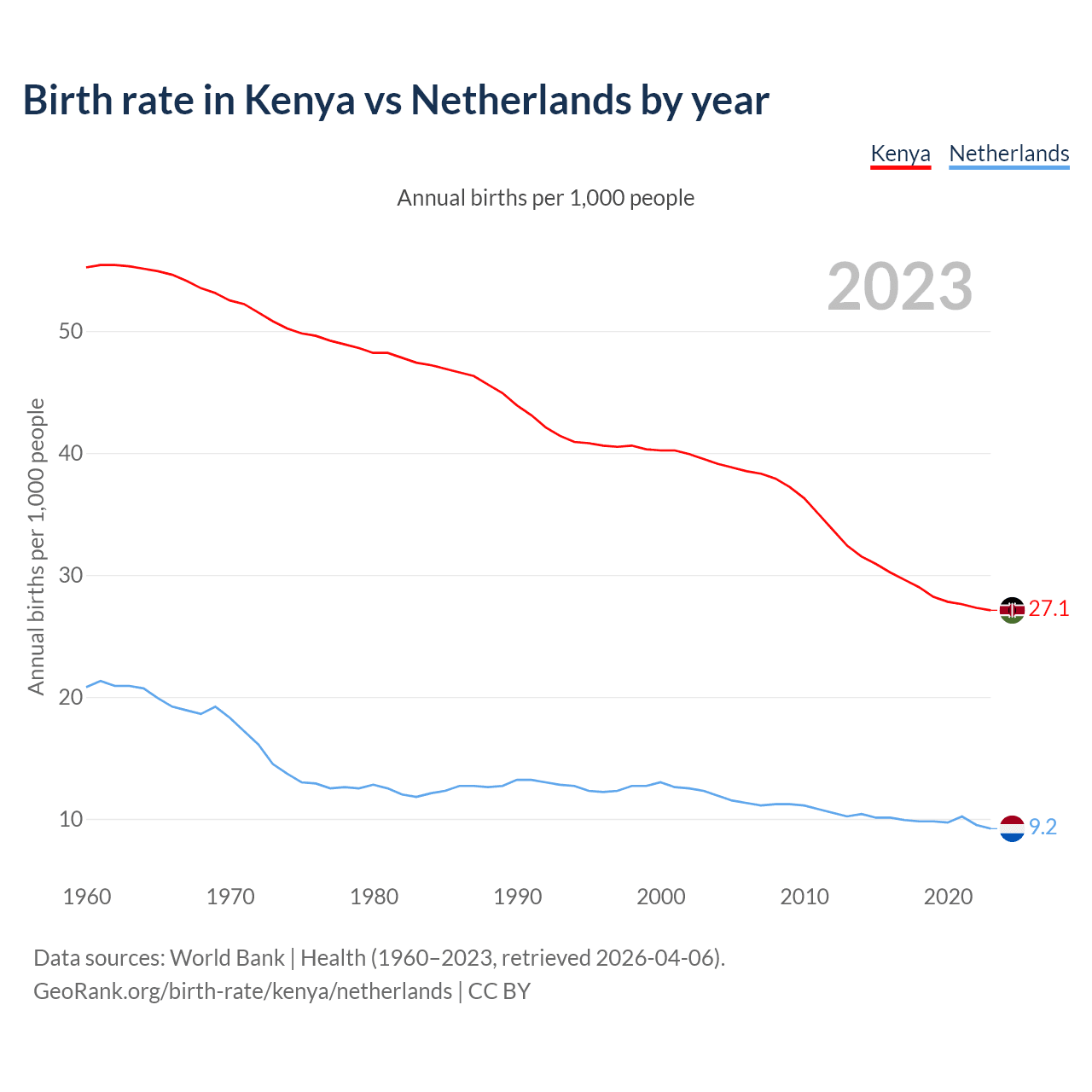 Kenya has an annual birth rate of 27.1 births per 1,000 people, compared to 9.2 for the Netherlands. The average number of children a woman is expected to have during her lifetime — the fertility rate, is 3.21 in Kenya and 1.43 in the Netherlands — 55.4% difference.
