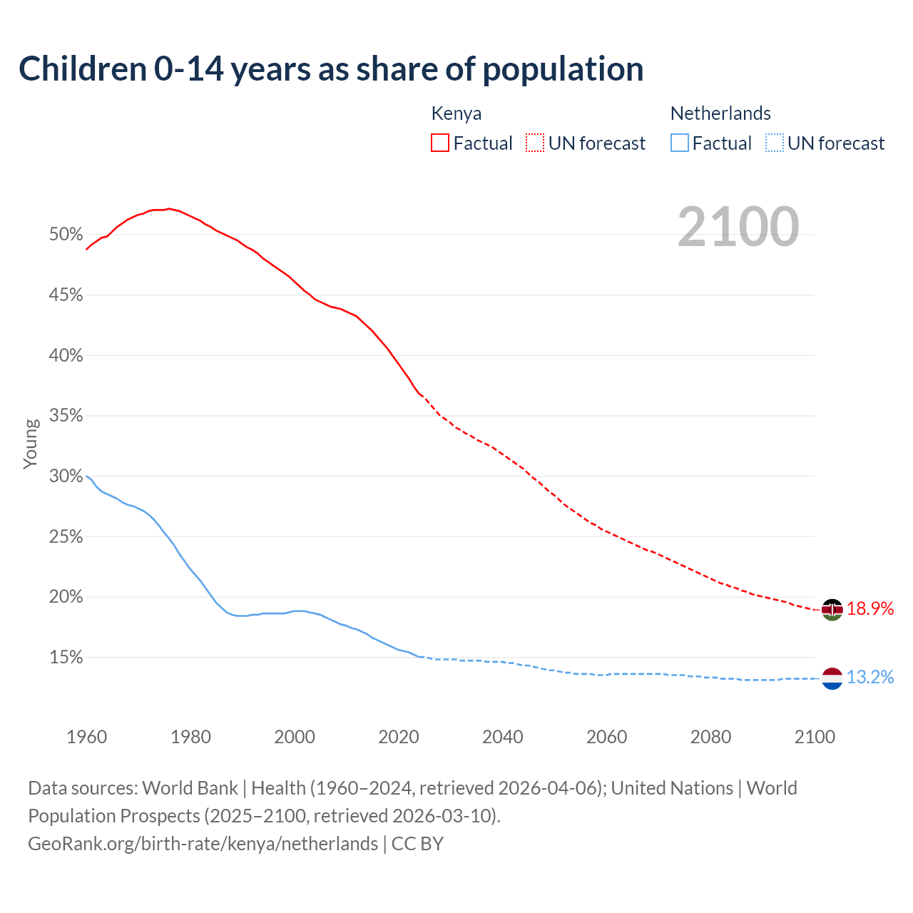 According to the latest available data on birth rates, the fertility rate in Kenya was 3.21 children per woman in 2023, compared to 1.43 in the Netherlands in 2023. The replacement level is considered to be 2.1 children per woman.