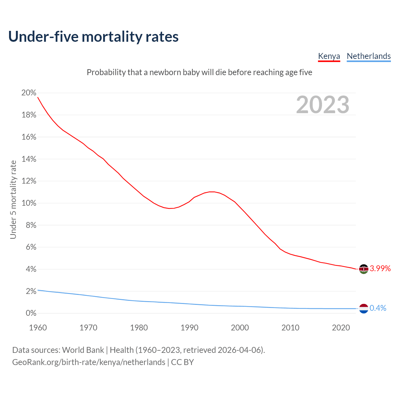 The chance that a newborn baby will die before reaching age five is 3.99% in Kenya and 0.4% in the Netherlands. Above is a chart with historical data on under-five mortality rates.