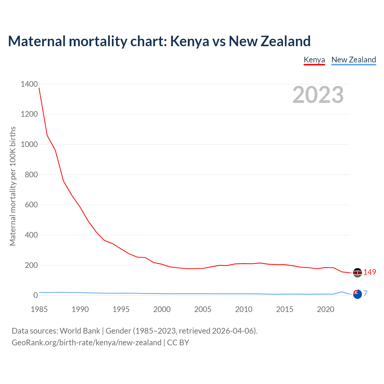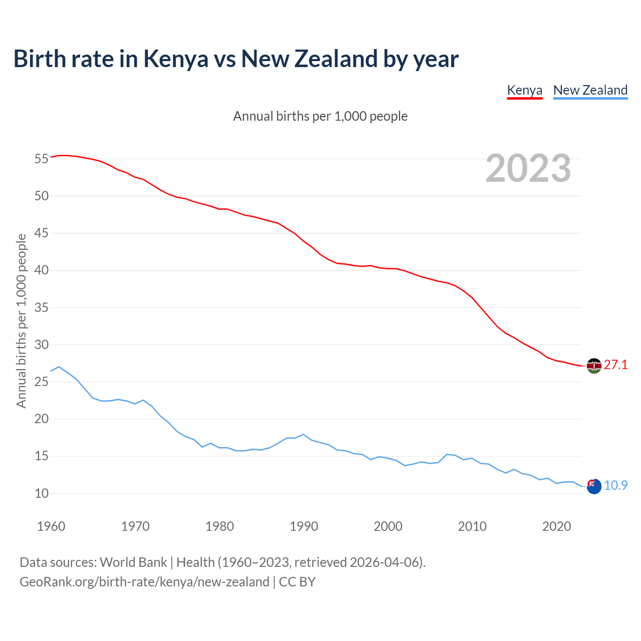 Kenya has an annual birth rate of 27.1 births per 1,000 people, compared to 10.9 for New Zealand. The average number of children a woman is expected to have during her lifetime — the fertility rate, is 3.21 in Kenya and 1.56 in New Zealand — 51.4% difference.