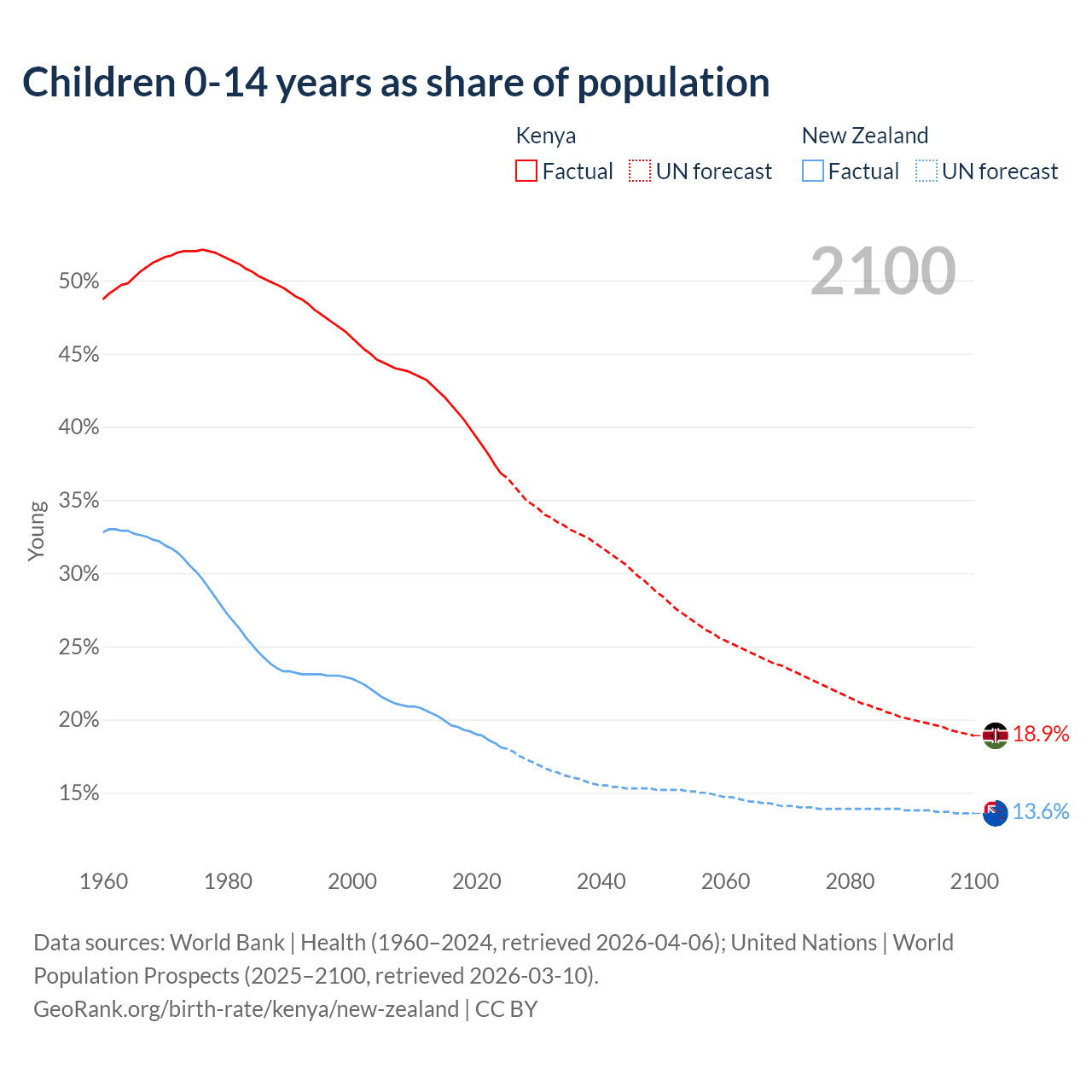 According to the latest available data on birth rates, the fertility rate in Kenya was 3.21 children per woman in 2023, compared to 1.56 in New Zealand in 2023. The replacement level is considered to be 2.1 children per woman.