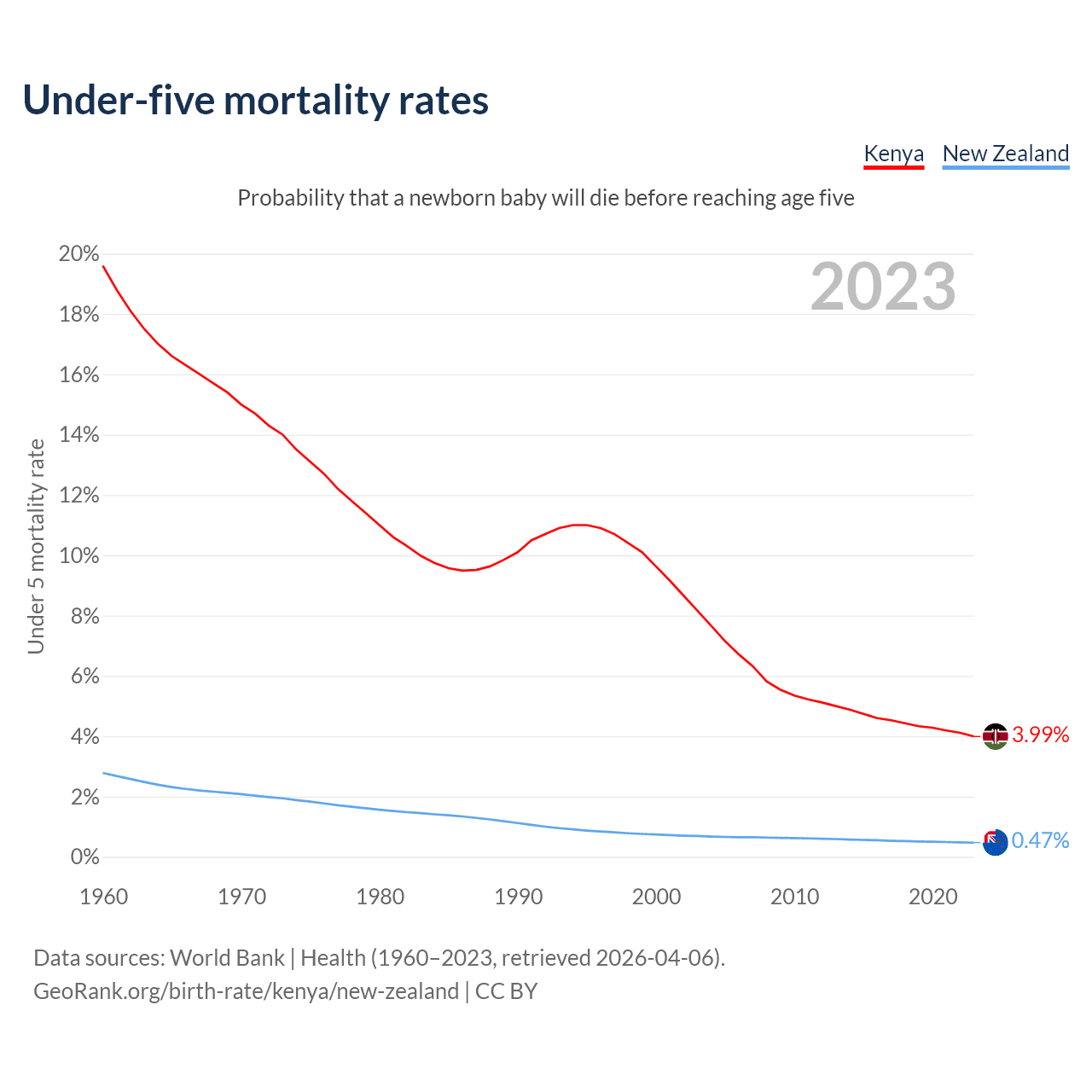 The chance that a newborn baby will die before reaching age five is 3.99% in Kenya and 0.47% in New Zealand. Above is a chart with historical data on under-five mortality rates.