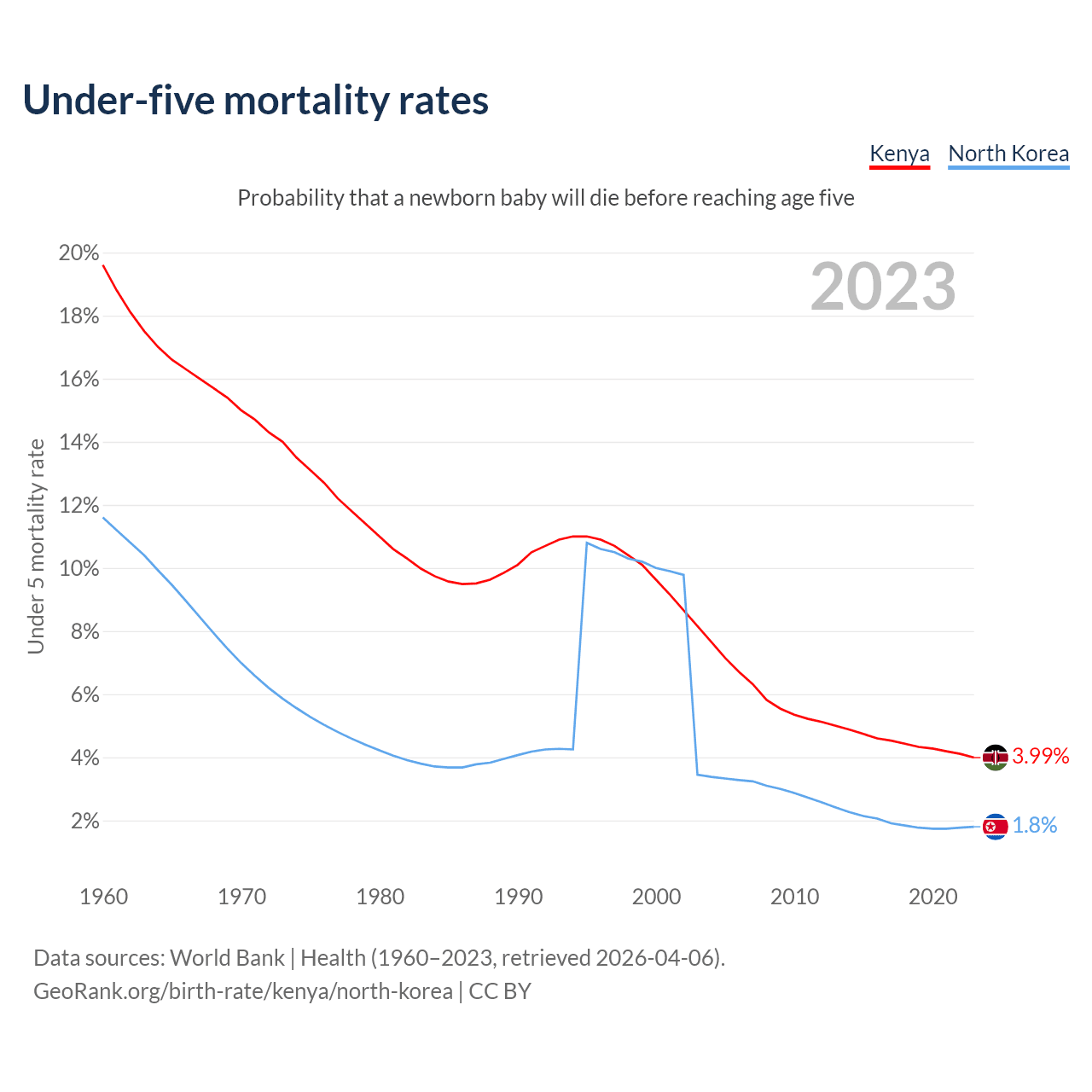 The chance that a newborn baby will die before reaching age five is 3.99% in Kenya and 1.8% in North Korea. Above is a chart with historical data on under-five mortality rates.