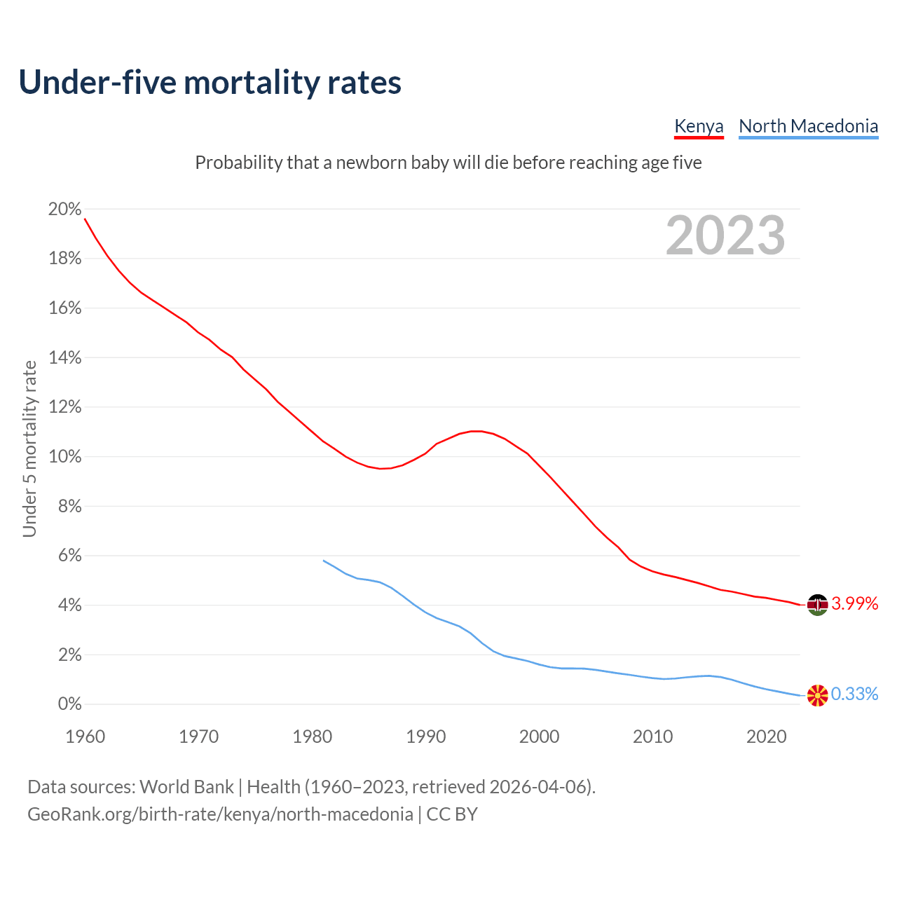 The chance that a newborn baby will die before reaching age five is 3.99% in Kenya and 0.33% in North Macedonia. Above is a chart with historical data on under-five mortality rates.