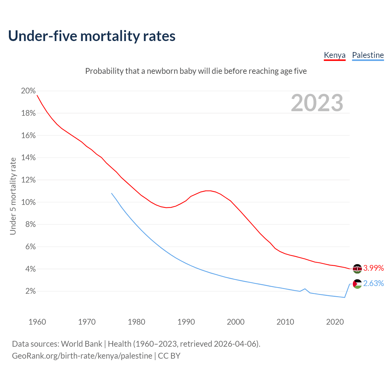 The chance that a newborn baby will die before reaching age five is 3.99% in Kenya and 2.63% in Palestine. Above is a chart with historical data on under-five mortality rates.