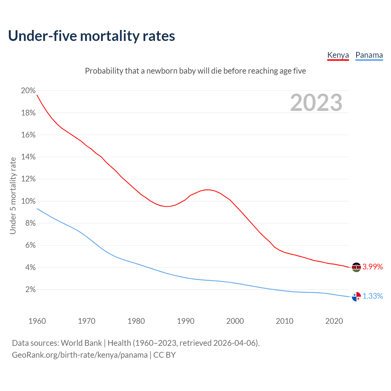 The chance that a newborn baby will die before reaching age five is 3.99% in Kenya and 1.33% in Panama. Above is a chart with historical data on under-five mortality rates.
