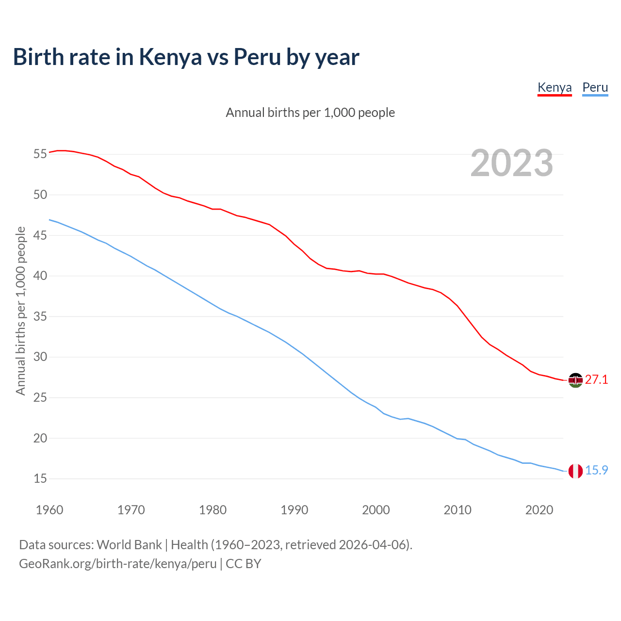 Kenya has an annual birth rate of 27.1 births per 1,000 people, compared to 15.9 for Peru. The average number of children a woman is expected to have during her lifetime — the fertility rate, is 3.21 in Kenya and 1.98 in Peru — 38.3% difference.