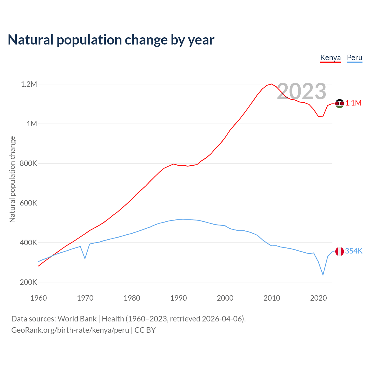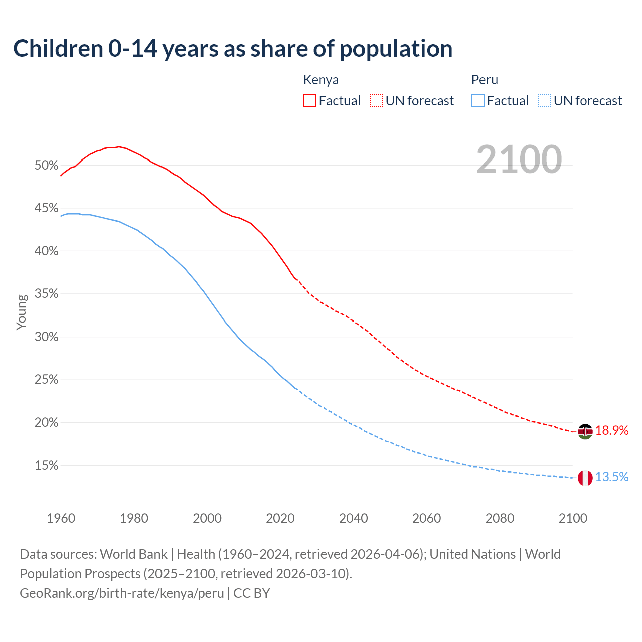 According to the latest available data on birth rates, the fertility rate in Kenya was 3.21 children per woman in 2023, compared to 1.98 in Peru in 2023. The replacement level is considered to be 2.1 children per woman.