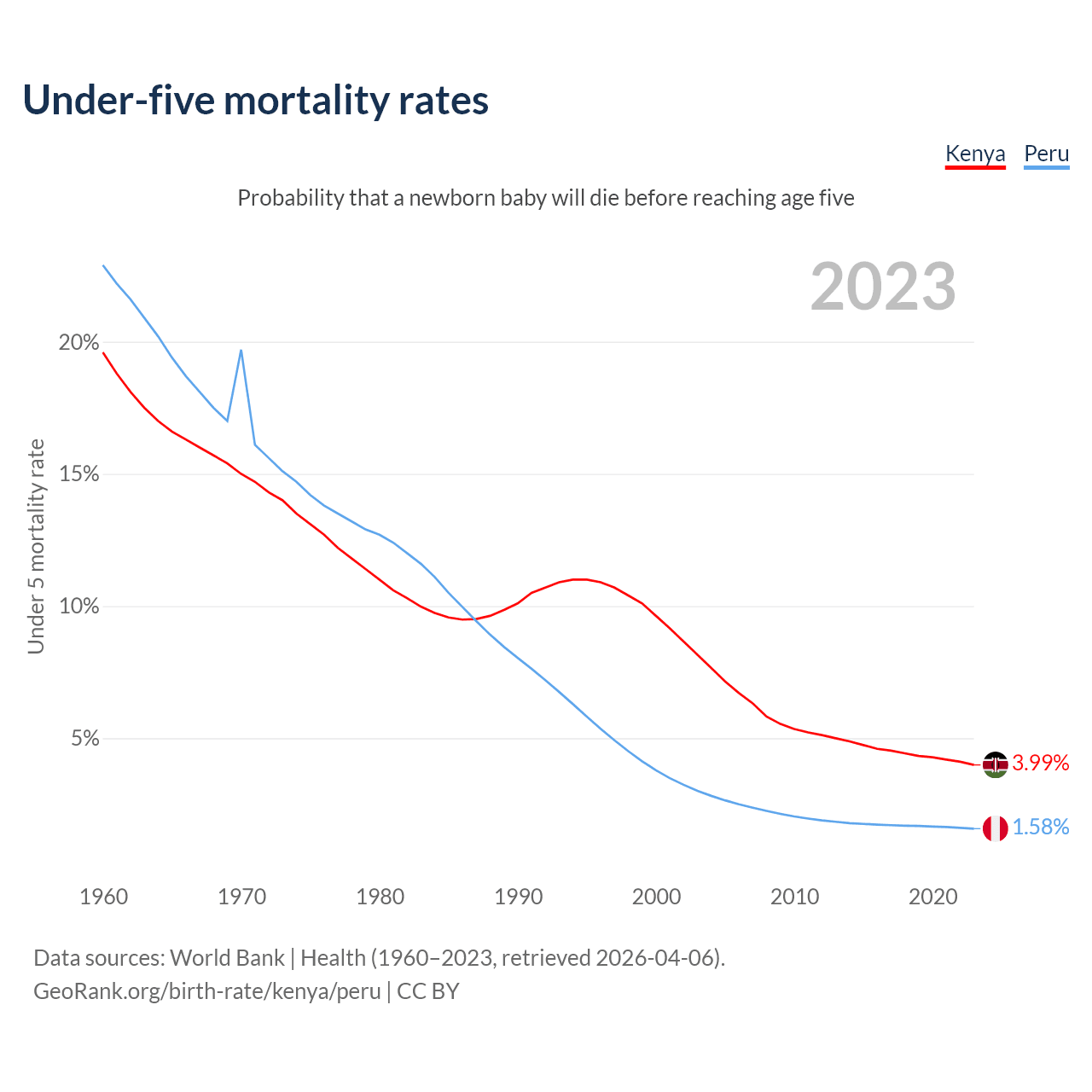 The chance that a newborn baby will die before reaching age five is 3.99% in Kenya and 1.58% in Peru. Above is a chart with historical data on under-five mortality rates.