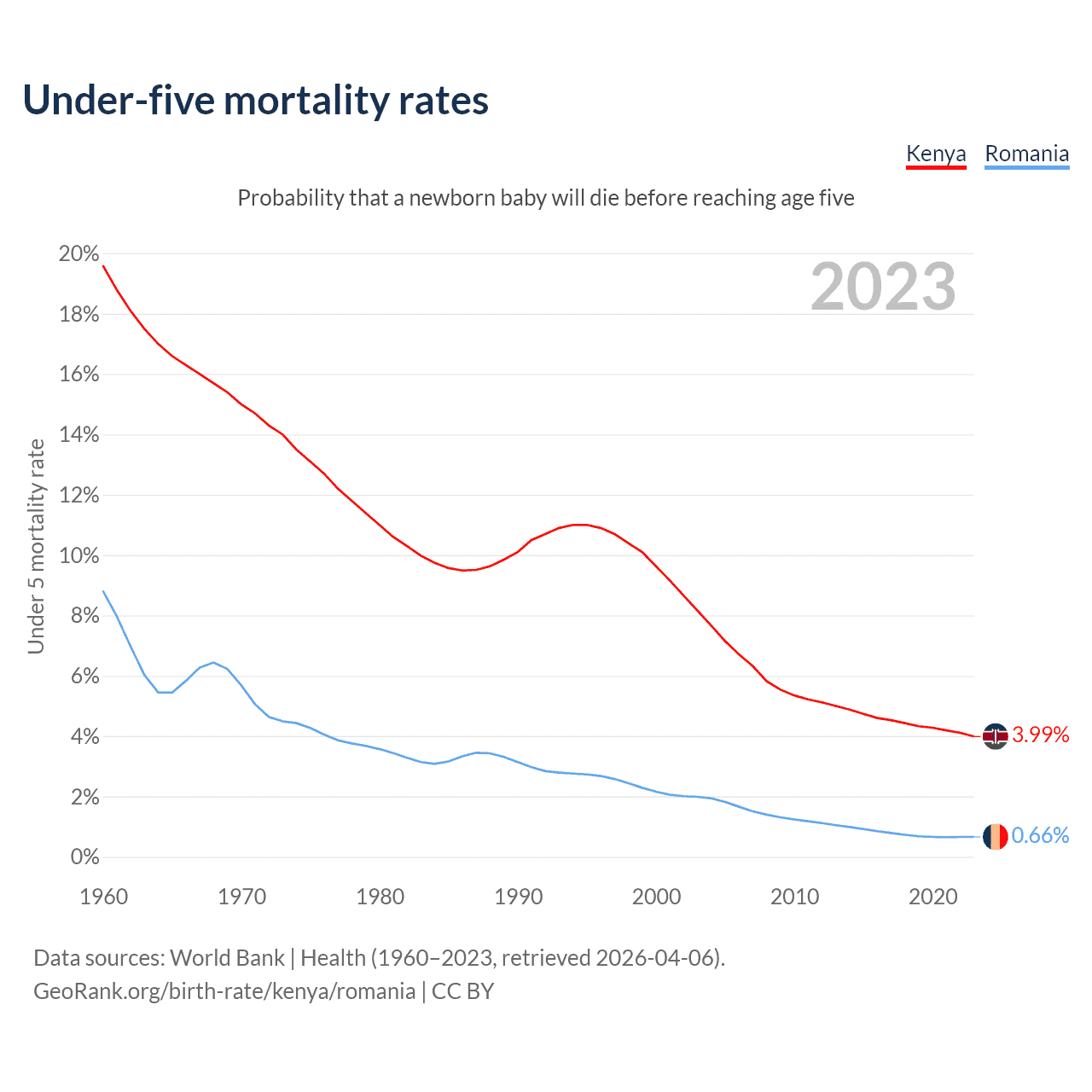 The chance that a newborn baby will die before reaching age five is 3.99% in Kenya and 0.66% in Romania. Above is a chart with historical data on under-five mortality rates.