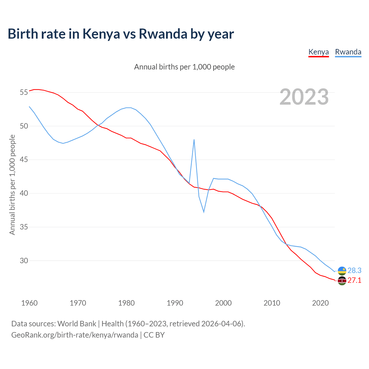 According to the latest available data on birth rates, the fertility rate in Kenya was 3.21 children per woman in 2023, compared to 3.7 in Rwanda in 2023. The replacement level is considered to be 2.1 children per woman.