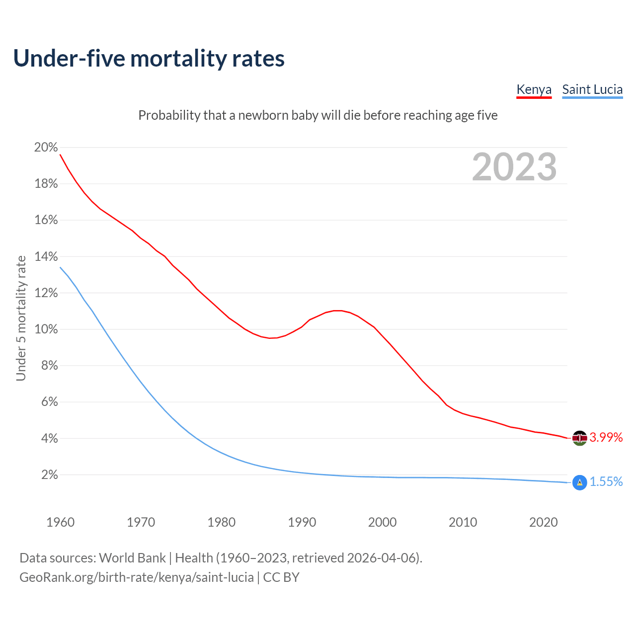 The chance that a newborn baby will die before reaching age five is 3.99% in Kenya and 1.55% in Saint Lucia. Above is a chart with historical data on under-five mortality rates.