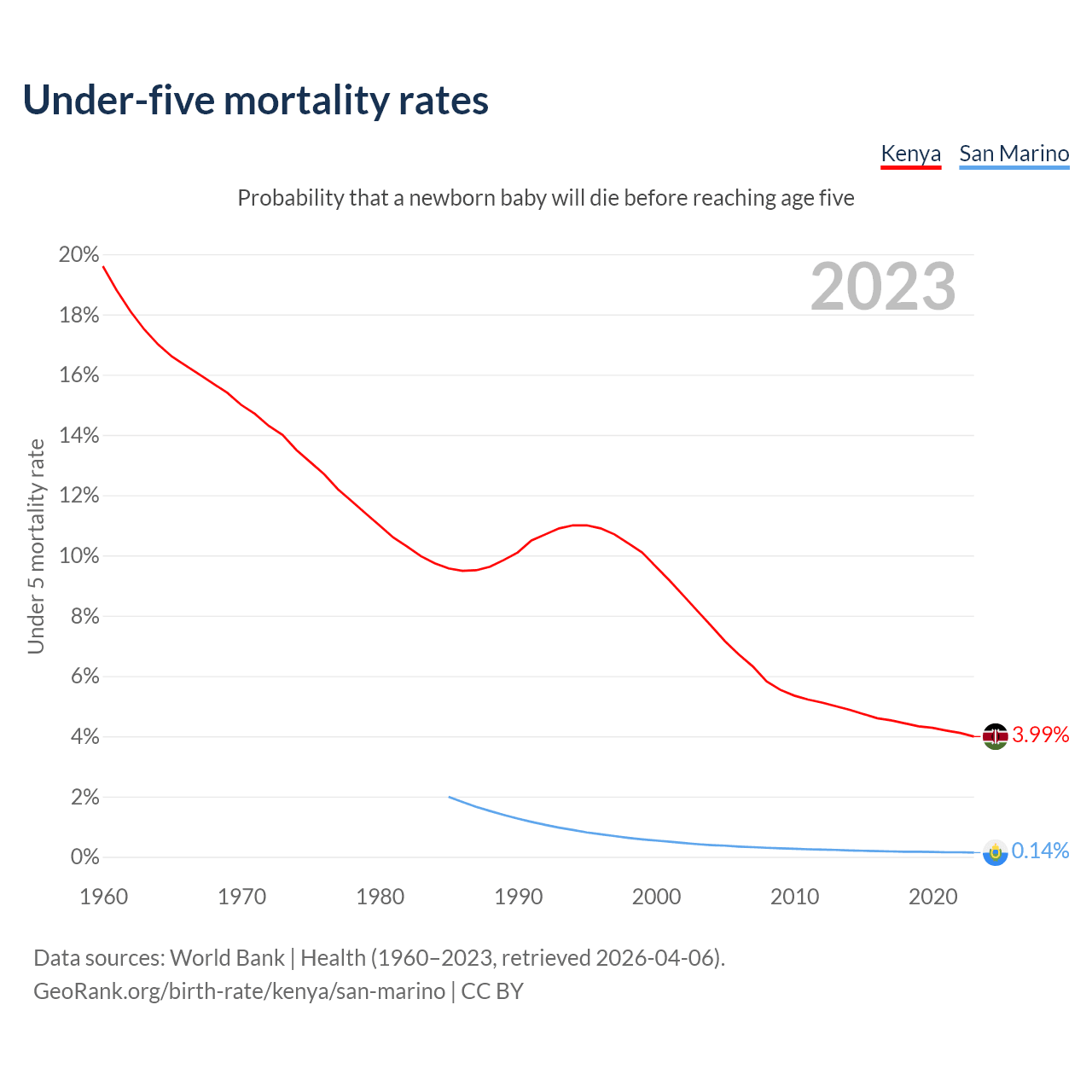 The chance that a newborn baby will die before reaching age five is 3.99% in Kenya and 0.14% in San Marino. Above is a chart with historical data on under-five mortality rates.