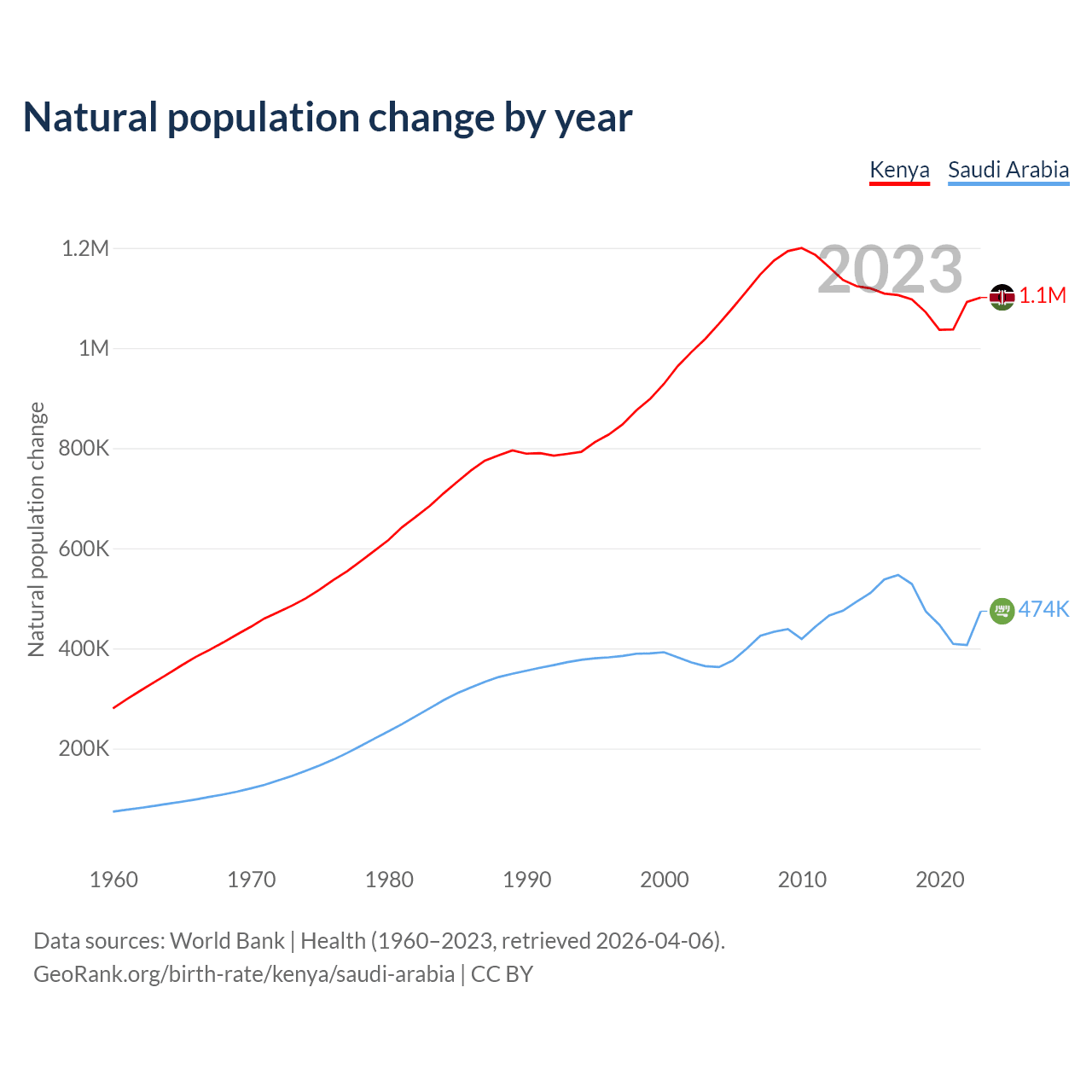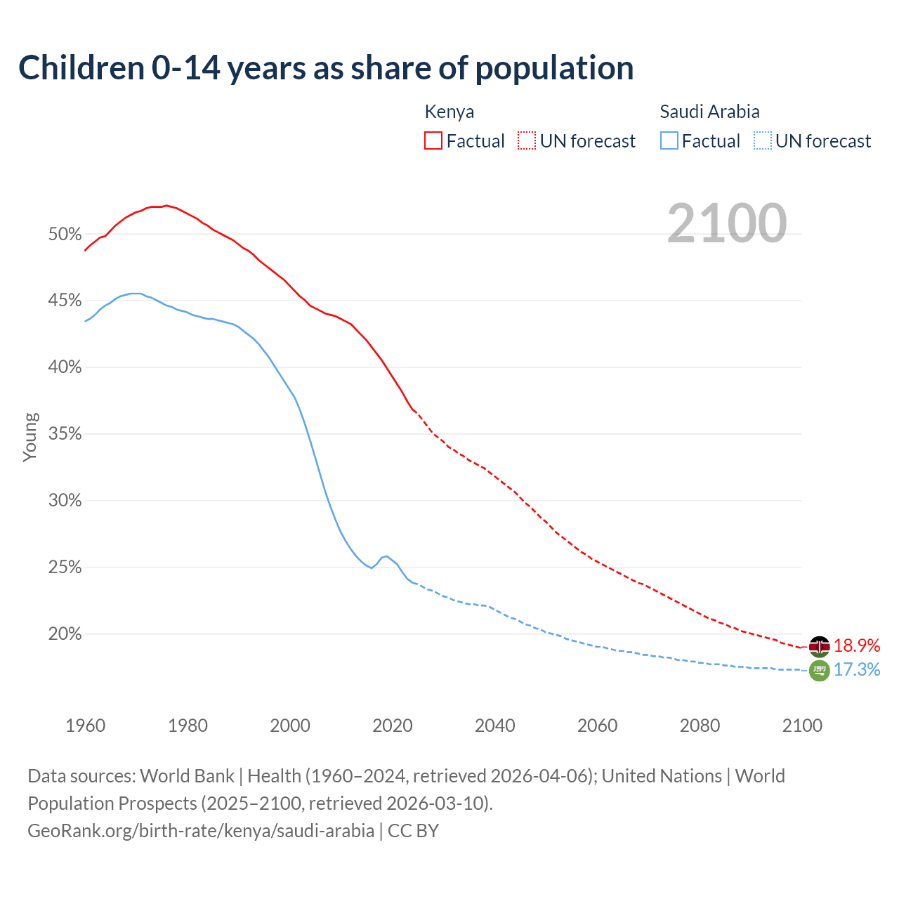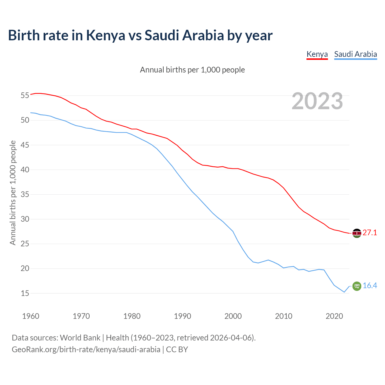 According to the latest available data on birth rates, the fertility rate in Kenya was 3.21 children per woman in 2023, compared to 2.28 in Saudi Arabia in 2023. The replacement level is considered to be 2.1 children per woman.