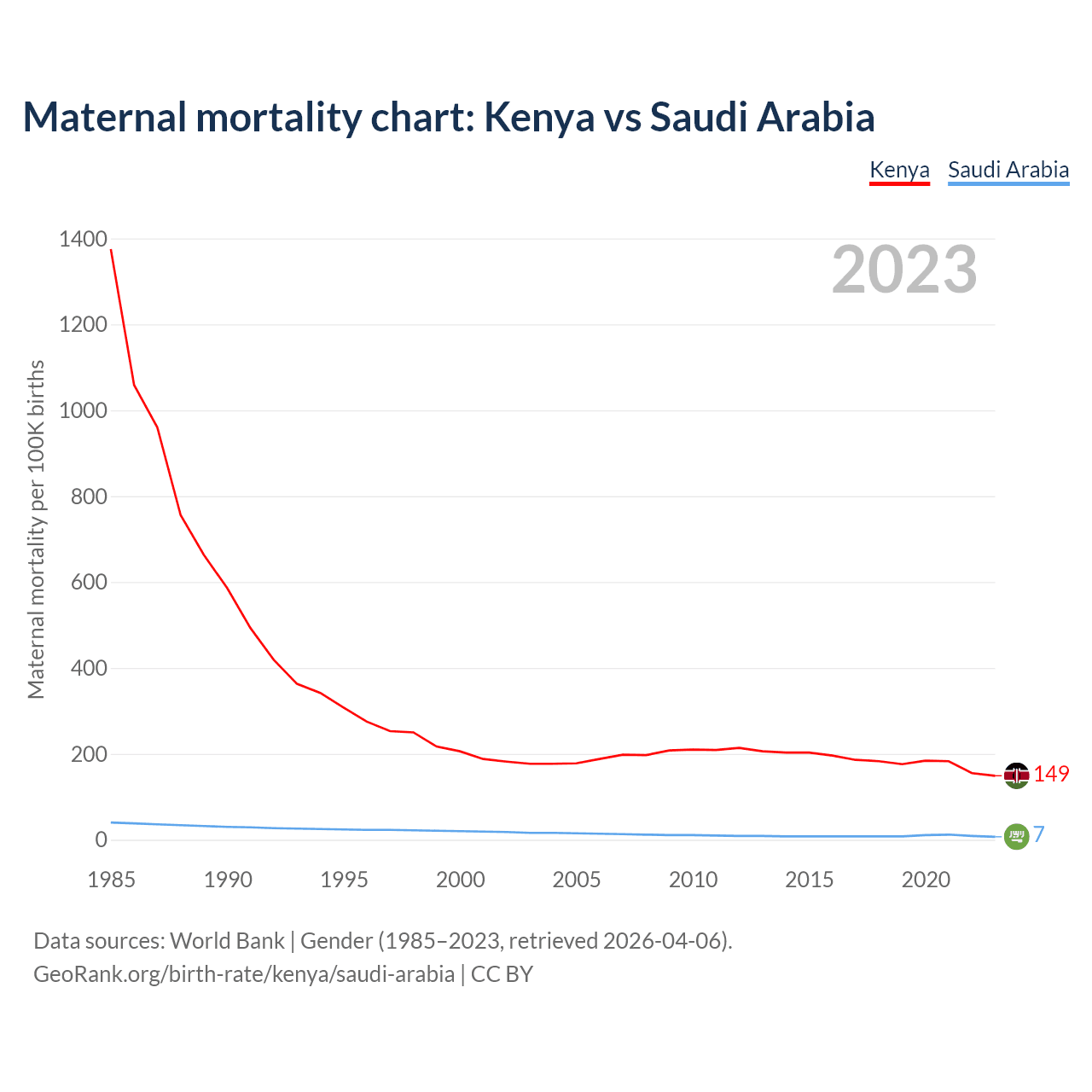 The maternal mortality rate, which is the probability of dying during childbirth or within 42 days of pregnancy termination, is 149 deaths per 100,000 live births in Kenya, compared to 7 deaths in Saudi Arabia.