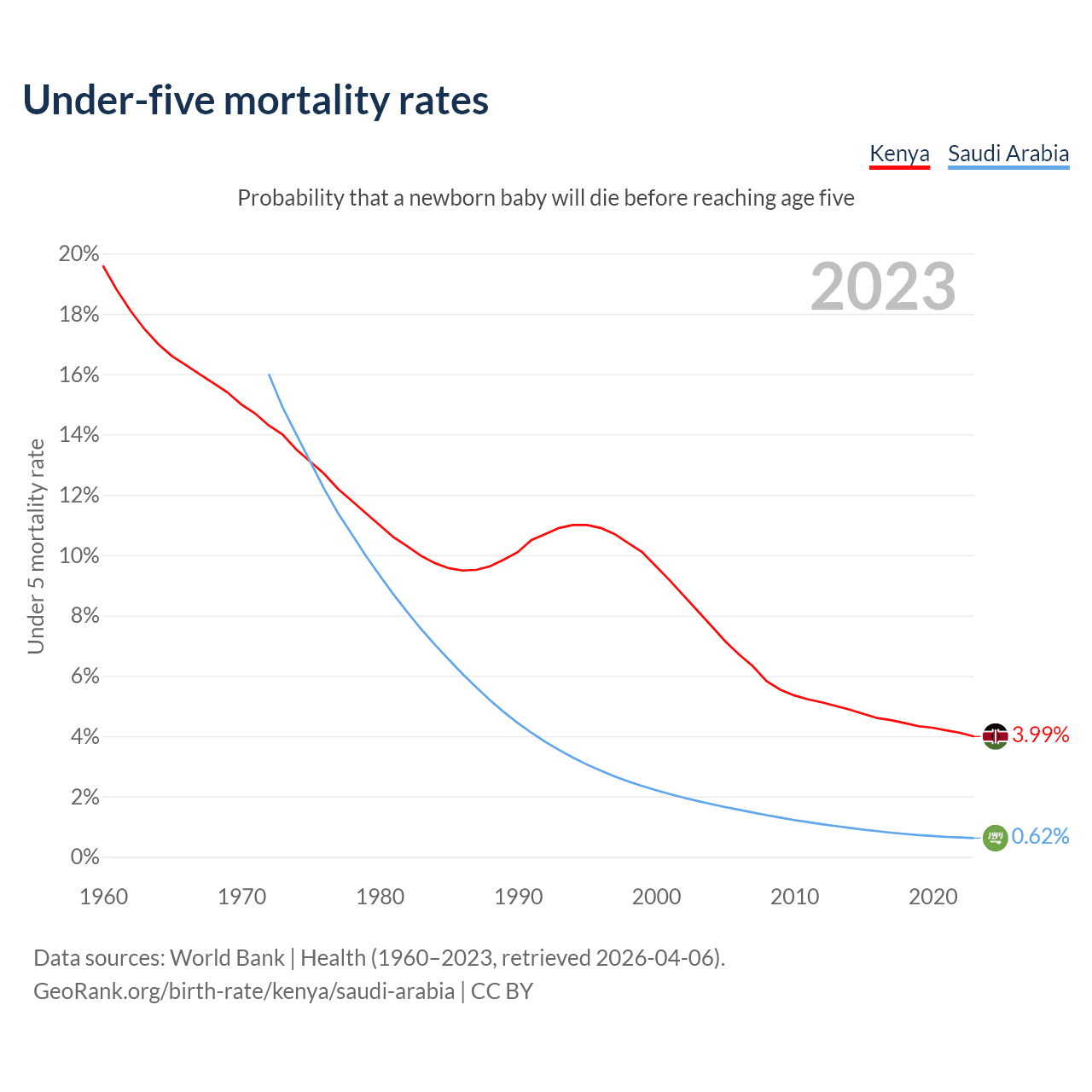 The chance that a newborn baby will die before reaching age five is 3.99% in Kenya and 0.62% in Saudi Arabia. Above is a chart with historical data on under-five mortality rates.