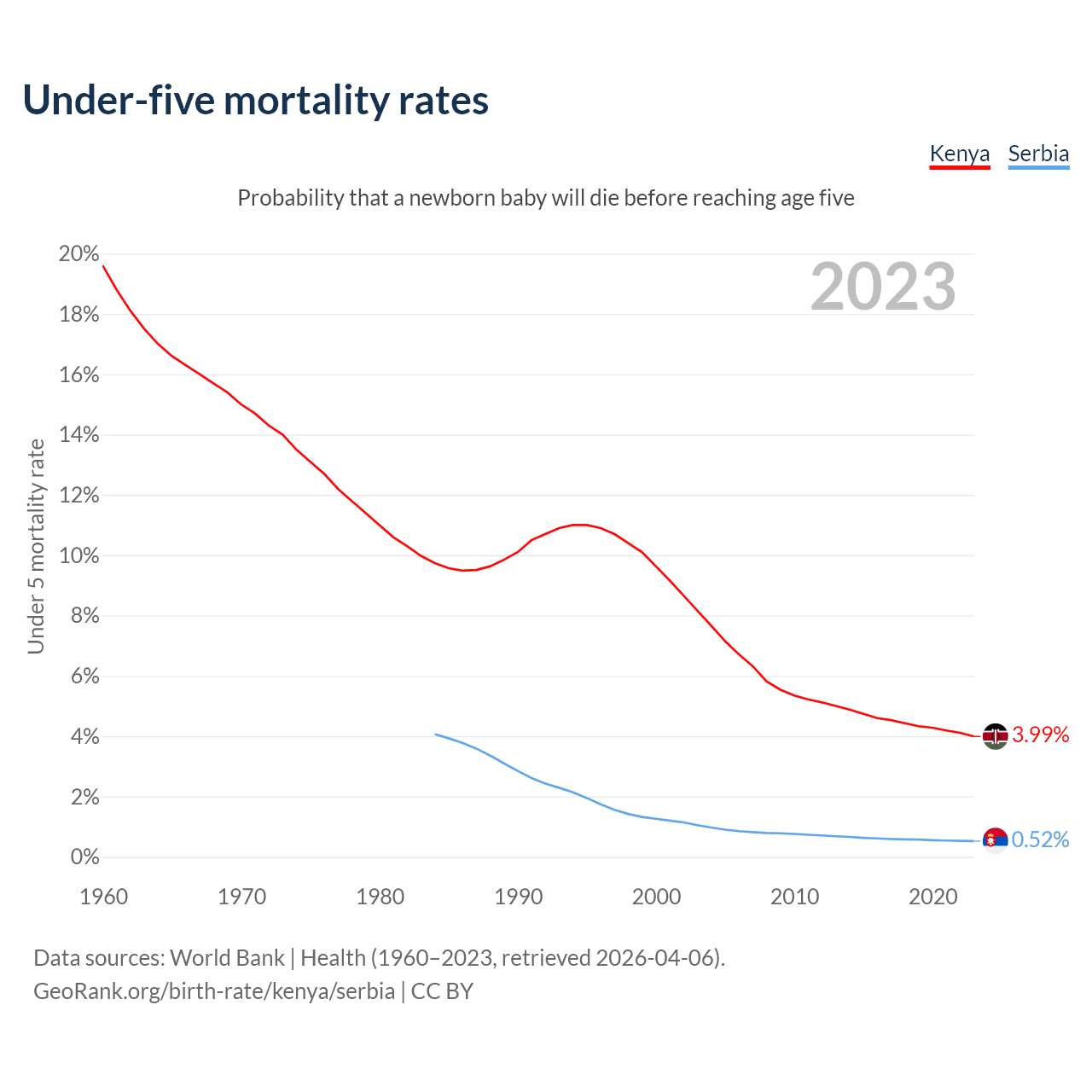 The chance that a newborn baby will die before reaching age five is 3.99% in Kenya and 0.52% in Serbia. Above is a chart with historical data on under-five mortality rates.
