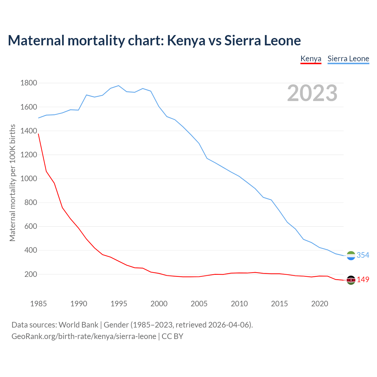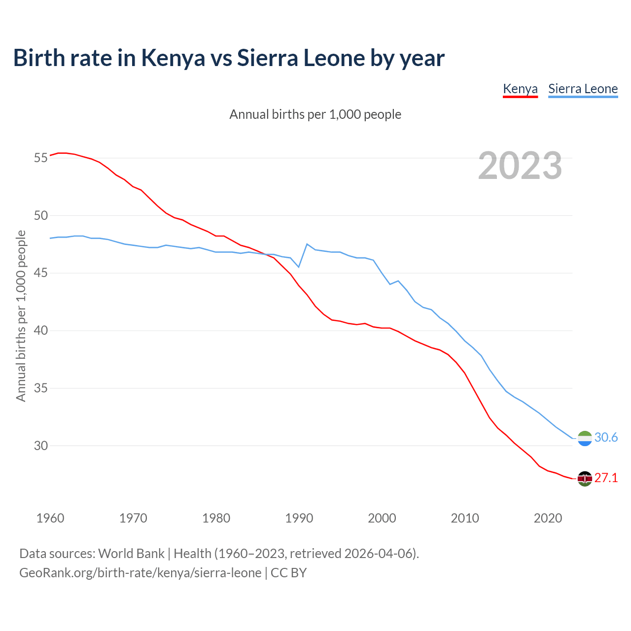 Kenya has an annual birth rate of 27.1 births per 1,000 people, compared to 30.6 for Sierra Leone. The average number of children a woman is expected to have during her lifetime — the fertility rate, is 3.21 in Kenya and 3.79 in Sierra Leone — 18.2% difference.