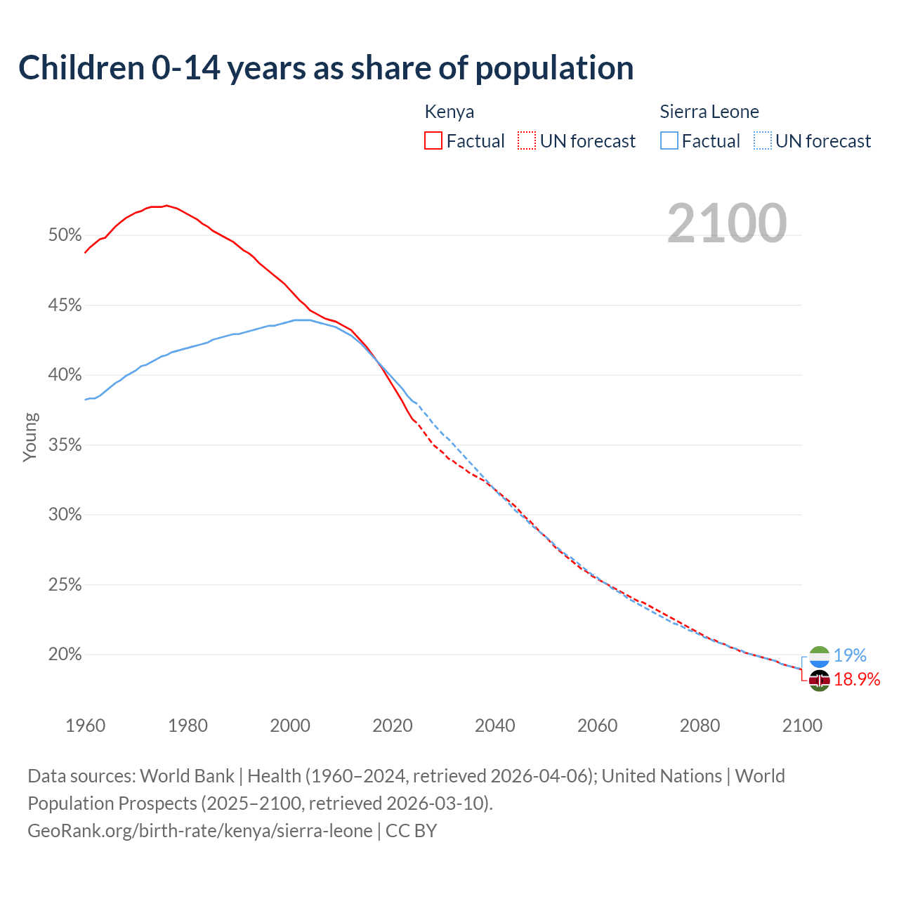 According to the latest available data on birth rates, the fertility rate in Kenya was 3.21 children per woman in 2023, compared to 3.79 in Sierra Leone in 2023. The replacement level is considered to be 2.1 children per woman.