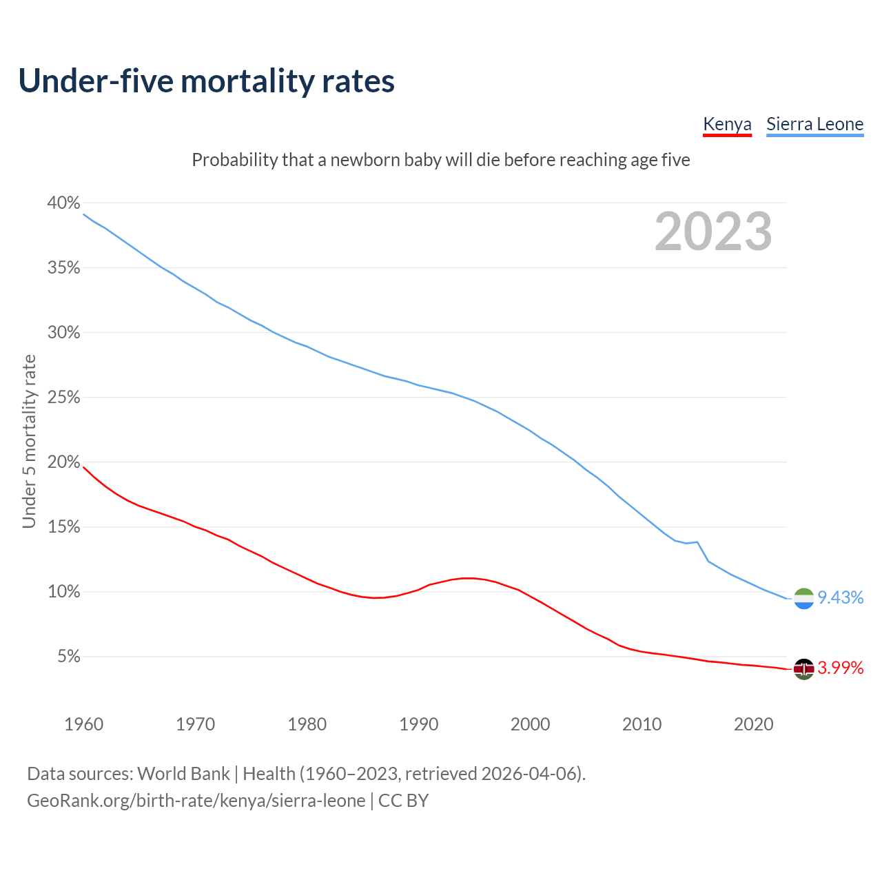 The chance that a newborn baby will die before reaching age five is 3.99% in Kenya and 9.43% in Sierra Leone. Above is a chart with historical data on under-five mortality rates.