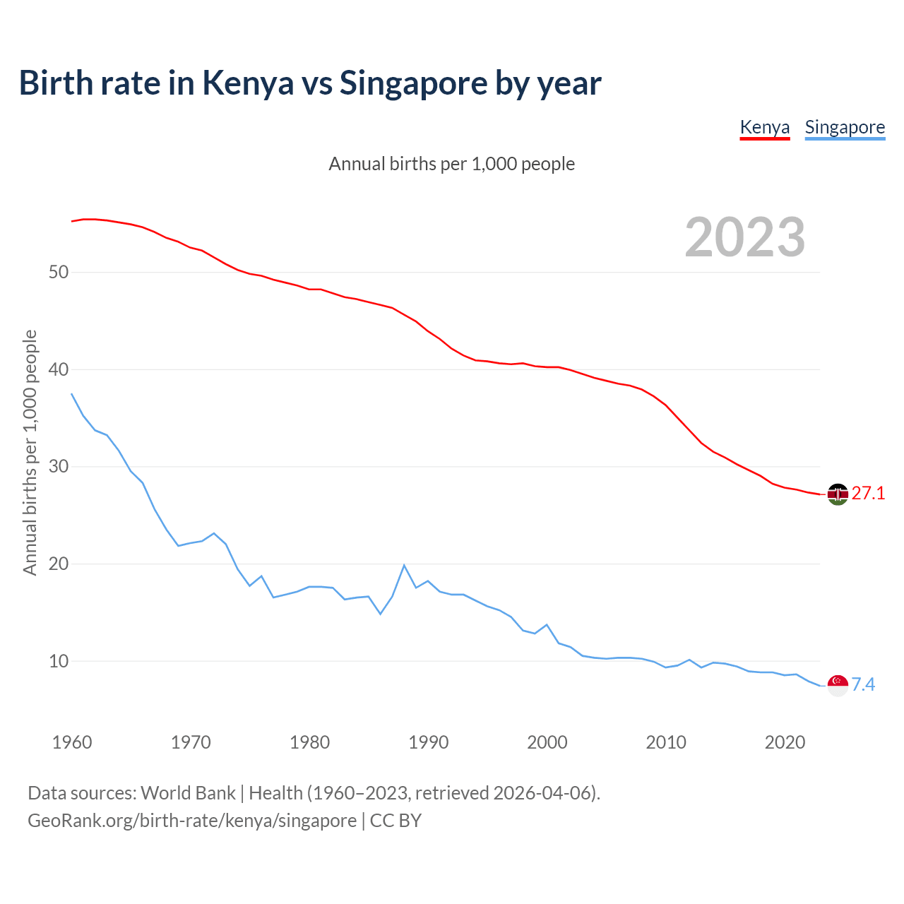 According to the latest available data on birth rates, the fertility rate in Kenya was 3.21 children per woman in 2023, compared to 0.97 in Singapore in 2023. The replacement level is considered to be 2.1 children per woman.