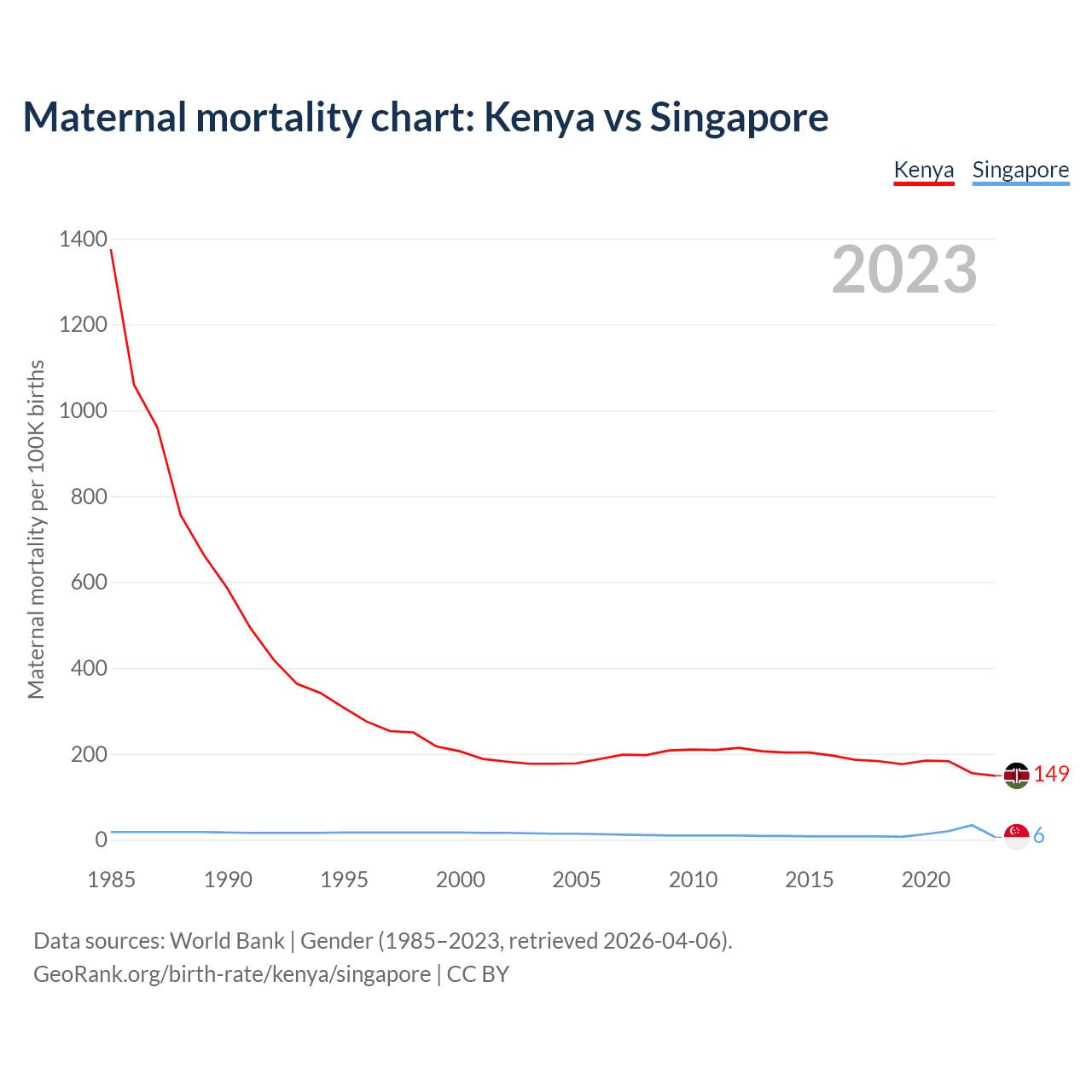 The maternal mortality rate, which is the probability of dying during childbirth or within 42 days of pregnancy termination, is 149 deaths per 100,000 live births in Kenya, compared to 6 deaths in Singapore.