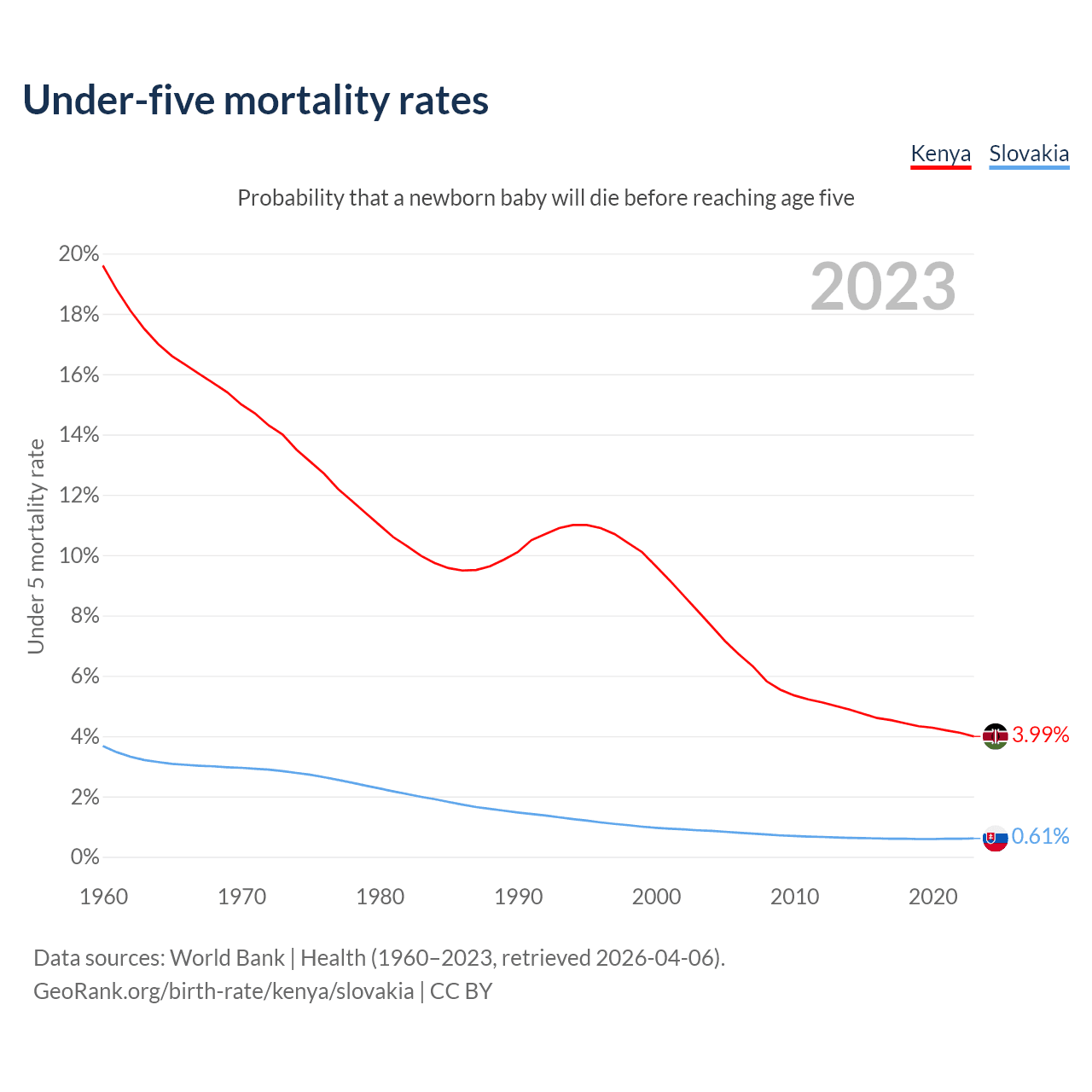 The chance that a newborn baby will die before reaching age five is 3.99% in Kenya and 0.61% in Slovakia. Above is a chart with historical data on under-five mortality rates.