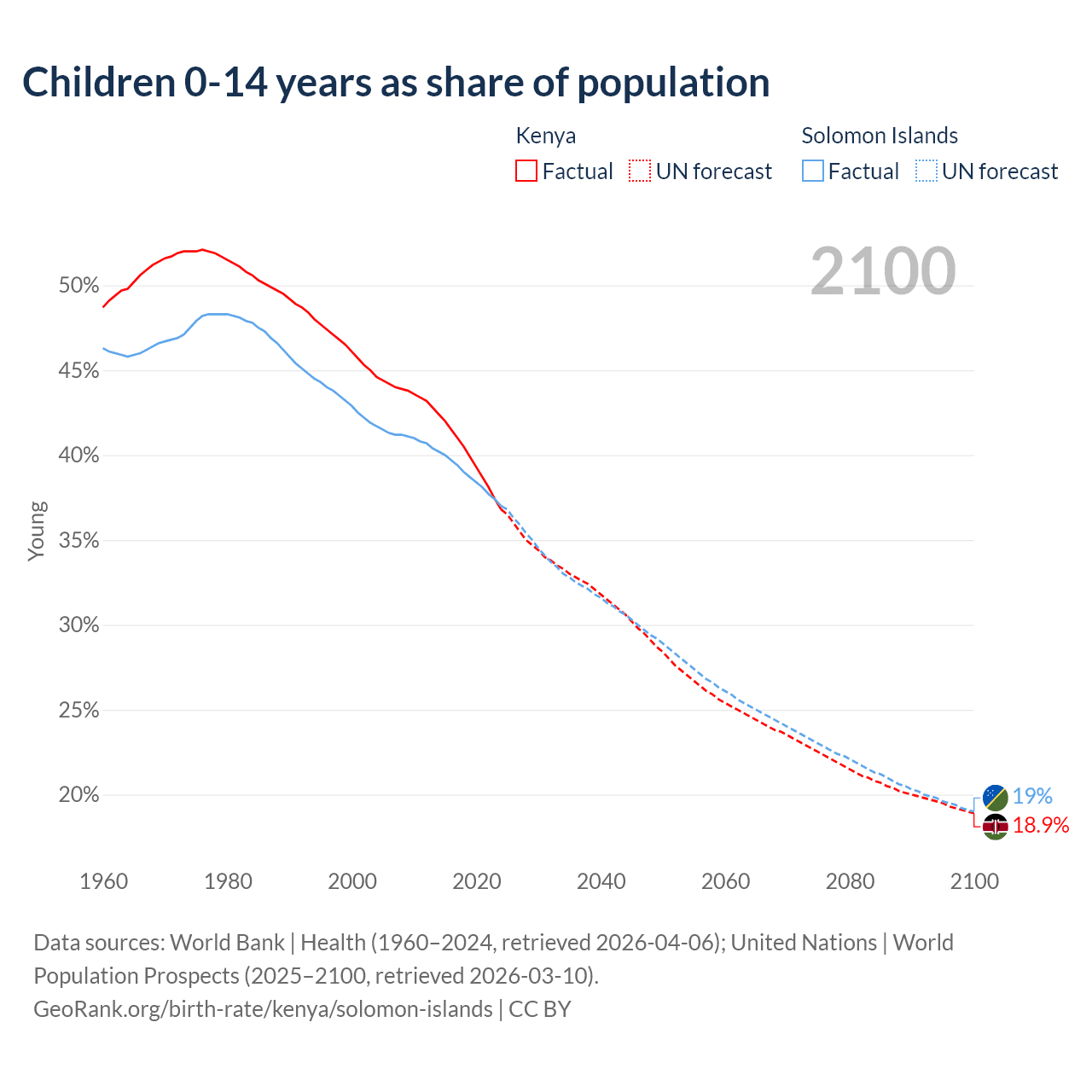 According to the latest available data on birth rates, the fertility rate in Kenya was 3.21 children per woman in 2023, compared to 3.56 in the Solomon Islands in 2023. The replacement level is considered to be 2.1 children per woman.