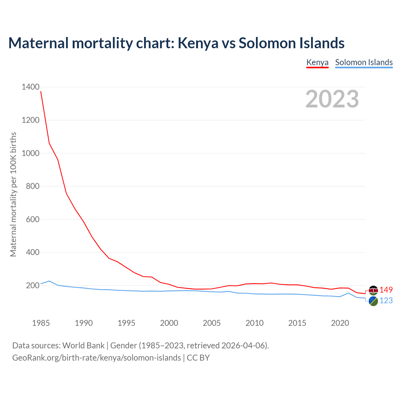 The maternal mortality rate, which is the probability of dying during childbirth or within 42 days of pregnancy termination, is 149 deaths per 100,000 live births in Kenya, compared to 123 deaths in the Solomon Islands.