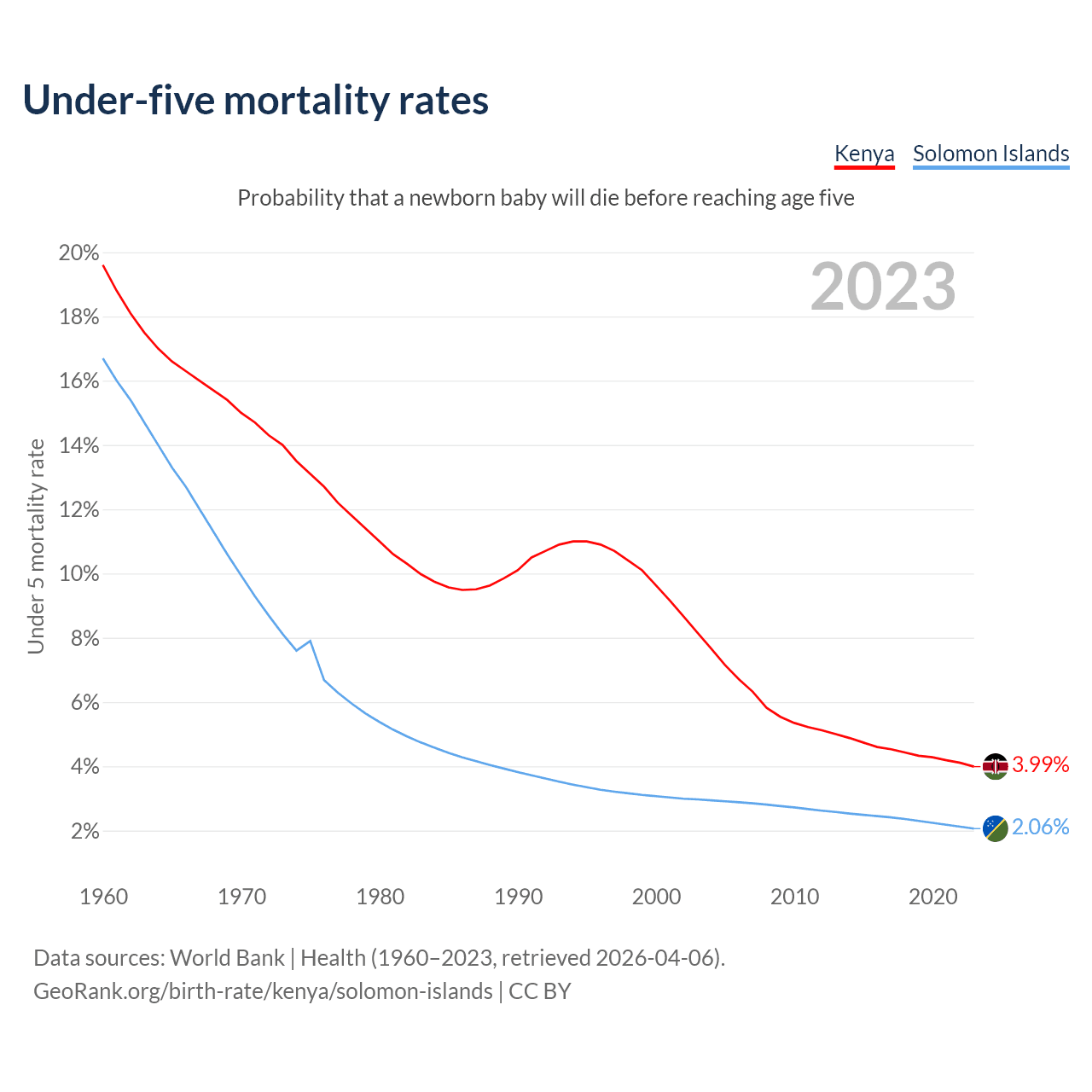 The chance that a newborn baby will die before reaching age five is 3.99% in Kenya and 2.06% in the Solomon Islands. Above is a chart with historical data on under-five mortality rates.