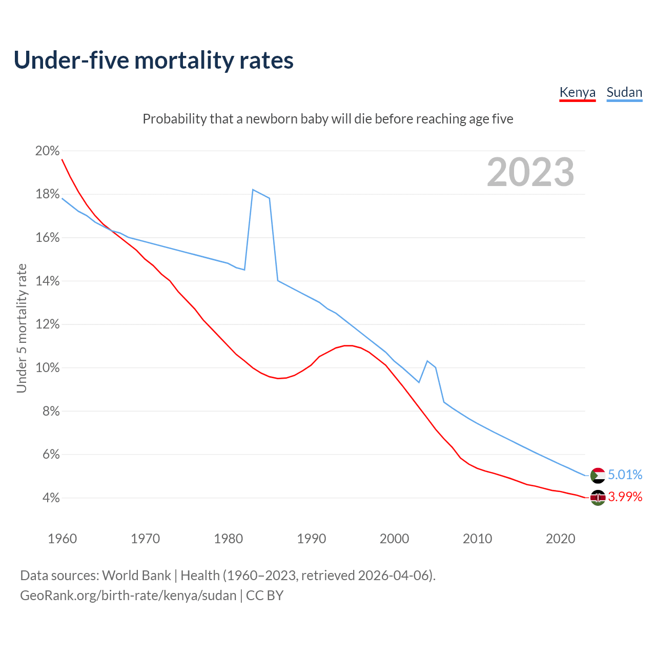 The chance that a newborn baby will die before reaching age five is 3.99% in Kenya and 5.01% in Sudan. Above is a chart with historical data on under-five mortality rates.