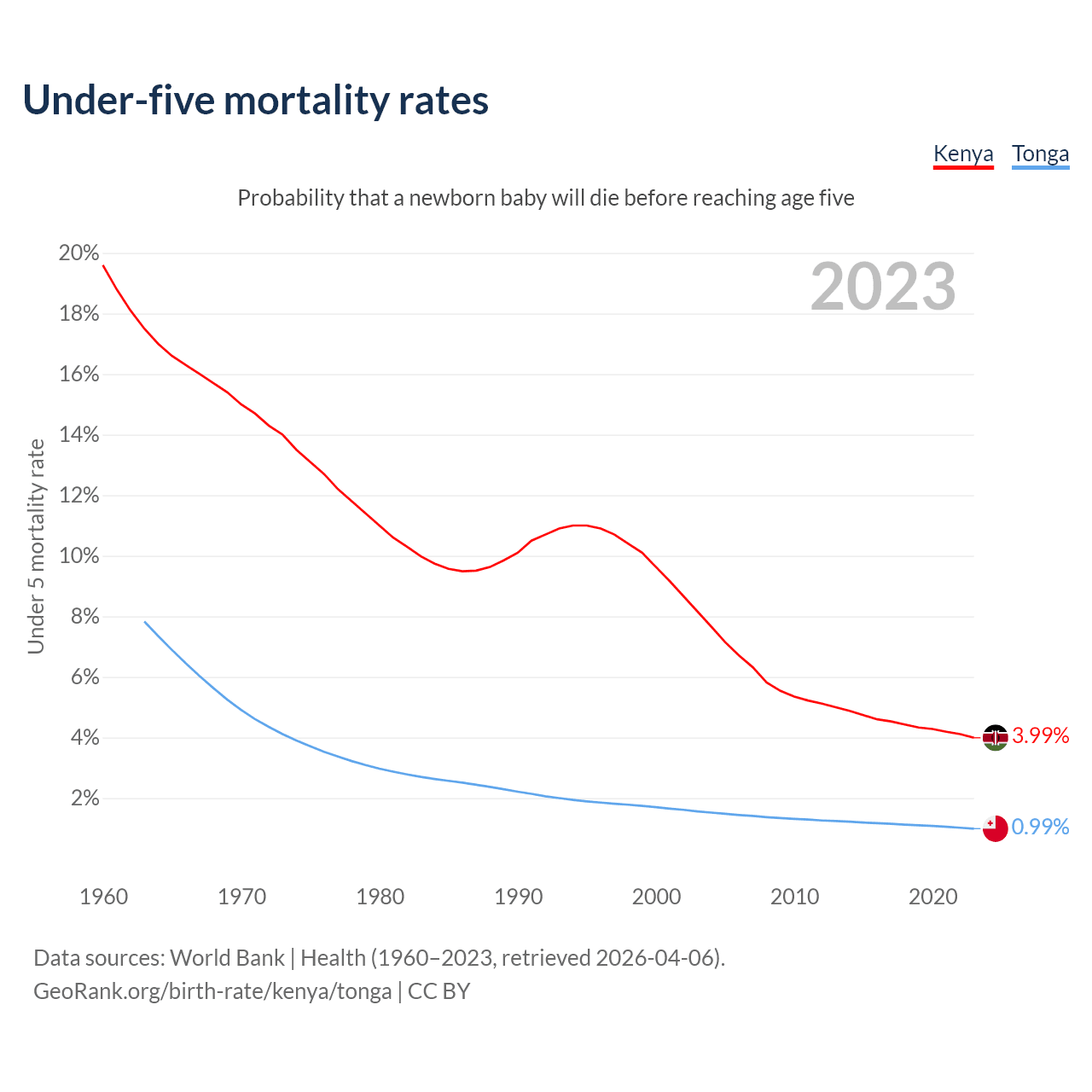 The chance that a newborn baby will die before reaching age five is 3.99% in Kenya and 0.99% in Tonga. Above is a chart with historical data on under-five mortality rates.