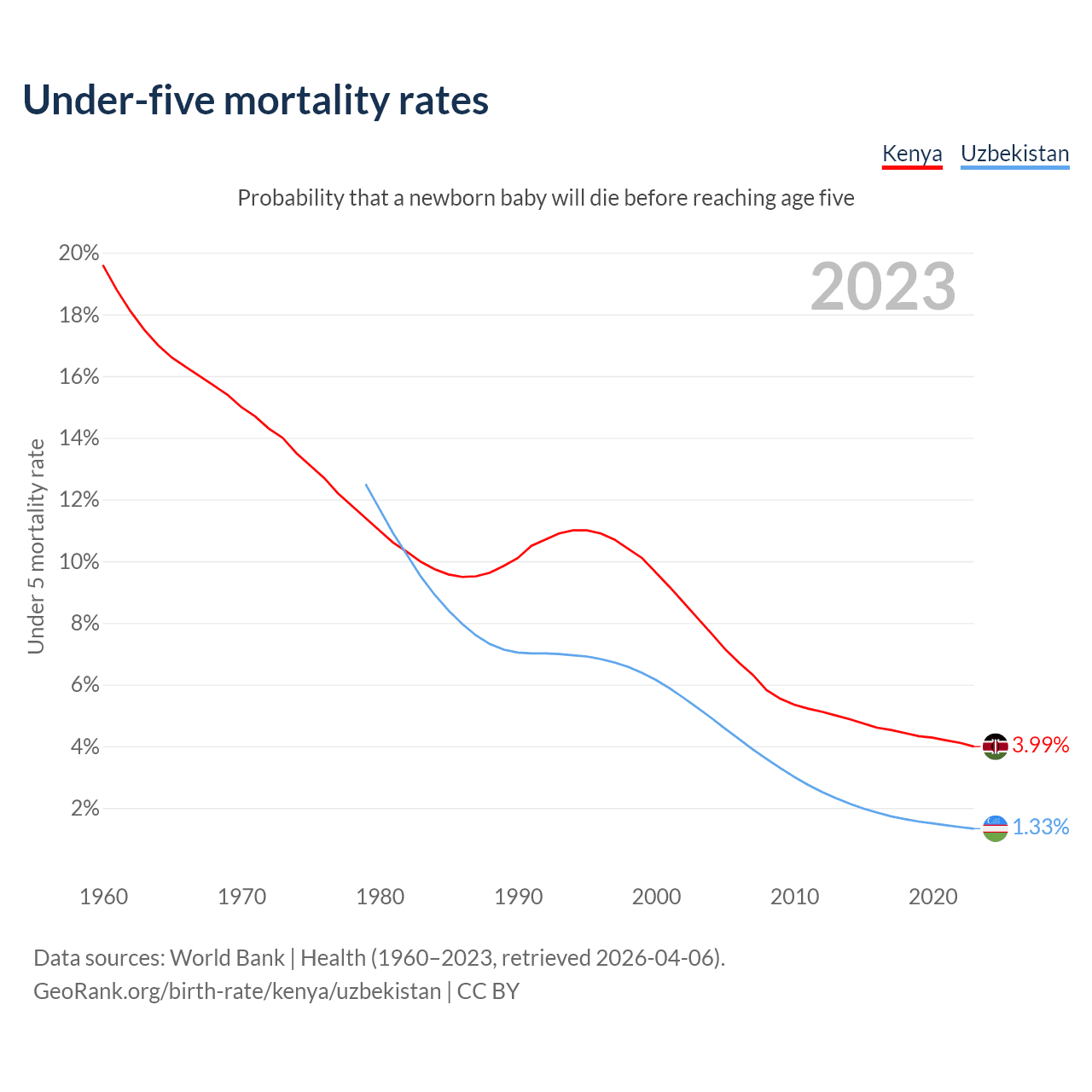 The chance that a newborn baby will die before reaching age five is 3.99% in Kenya and 1.33% in Uzbekistan. Above is a chart with historical data on under-five mortality rates.