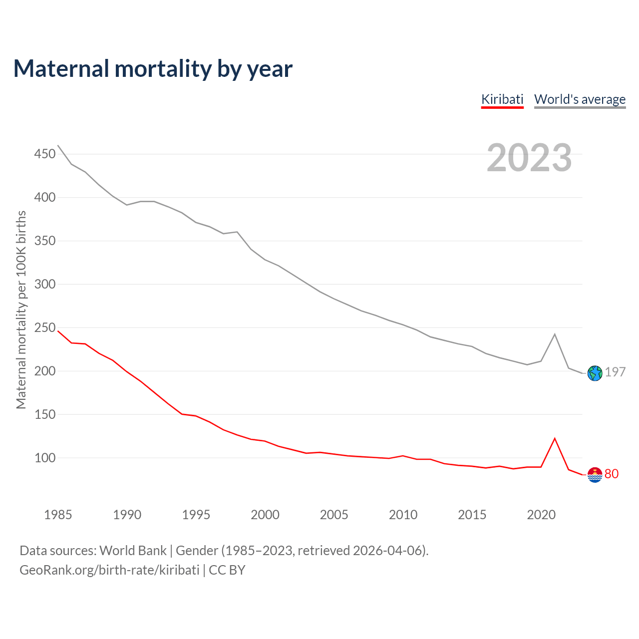 The maternal mortality rate in Kiribati was 80 deaths per 100,000 live births in 2023 — a 0.08% chance of dying during childbirth or within 42 days of pregnancy termination. This is a 32.8% decrease compared to the year 2000.