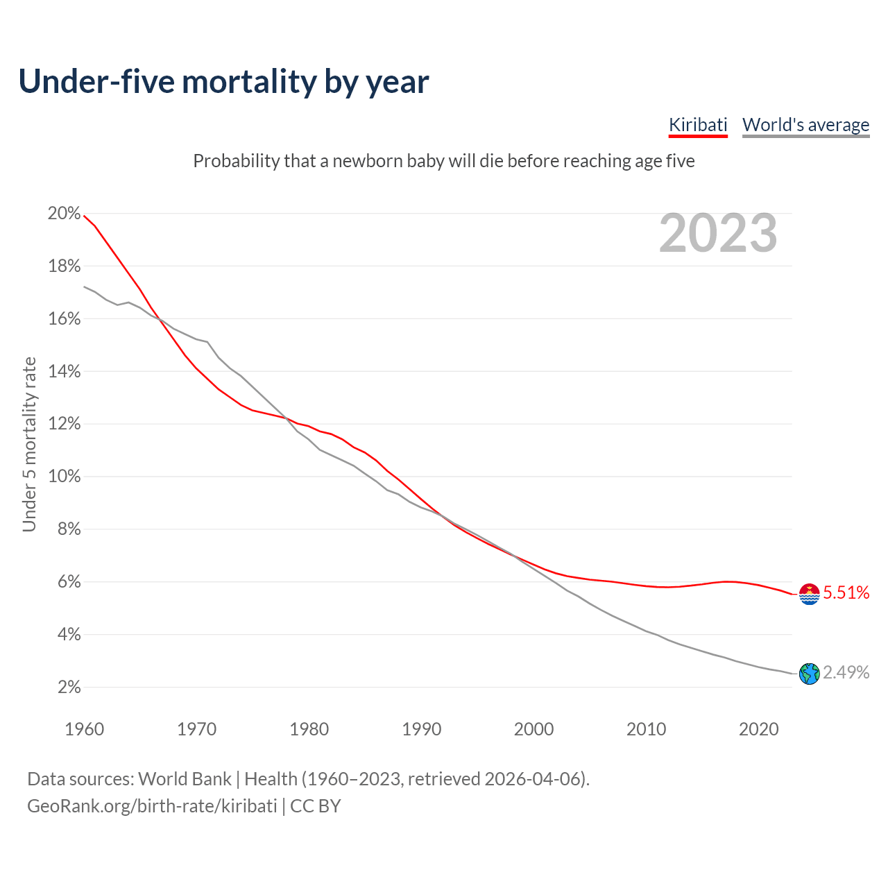 The under-5 mortality rate in Kiribati was 55.1 deaths per 1,000 live births in 2023 — a 5.51% chance that a newborn baby will die before reaching age five. This is down from 66.4 deaths per 1,000 live births in 2000.