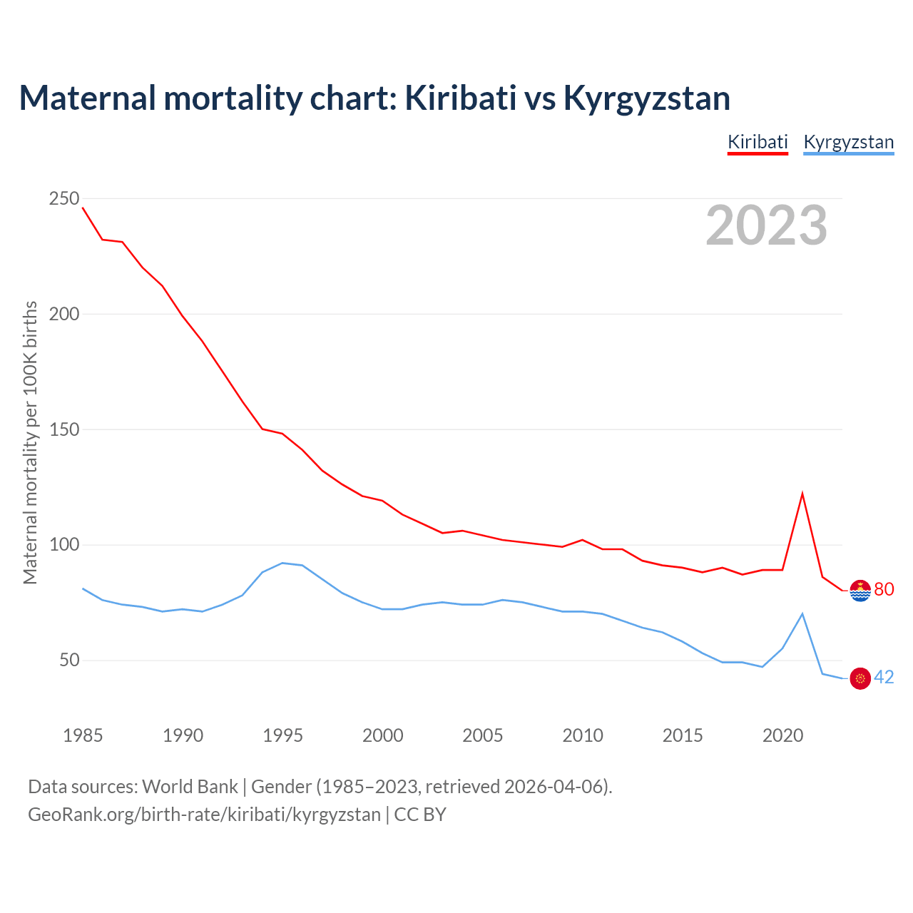 The maternal mortality rate, which is the probability of dying during childbirth or within 42 days of pregnancy termination, is 80 deaths per 100,000 live births in Kiribati, compared to 42 deaths in Kyrgyzstan.
